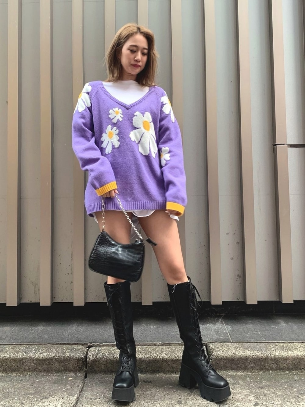 かわいすぎなお花にっと🌼🌼💓 今年っぽくロンTとレイヤードしました✨ ミドルブーツ合わせて甘く なりすぎないように👏