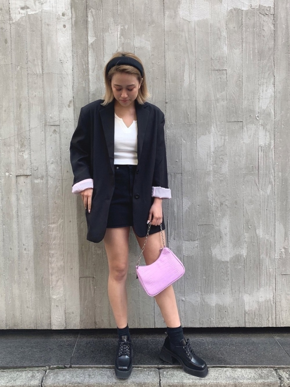 キレイめモノトーンコーデ💗 JKの袖の折り返した部分がピンクなのが ポイントでかわいい💗❤️ バッグもピンクで合わせました🥰 ミニスカート合わせで少しカジュアルに✨