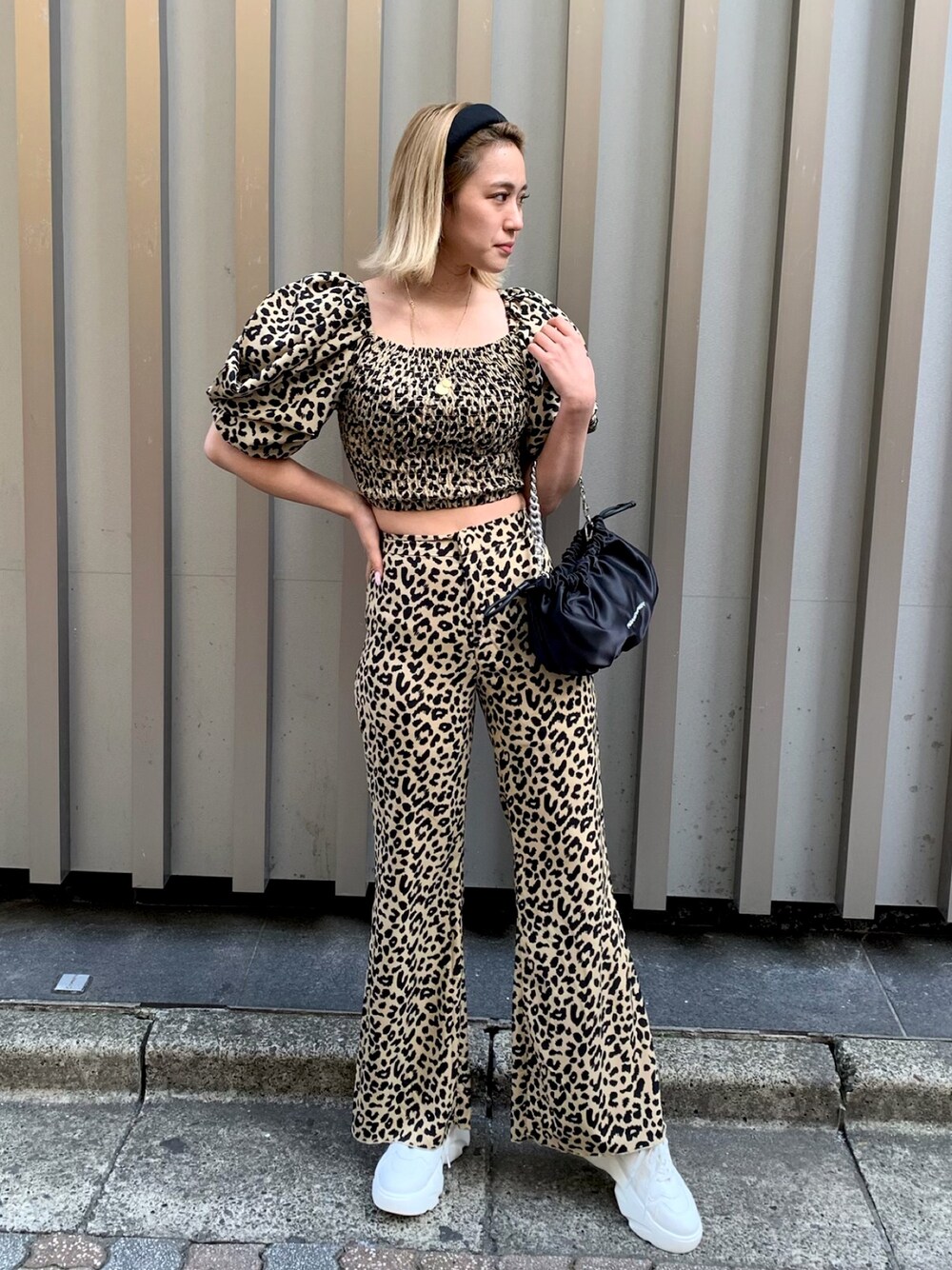 レオパードのセットアップ❤️ 派手かわ🐆💕 ハイウエストのフレアパンツにショート丈TOPSで脚長効果抜群コーデ✨👏 スニーカーでカジュアルに合わせました✌️