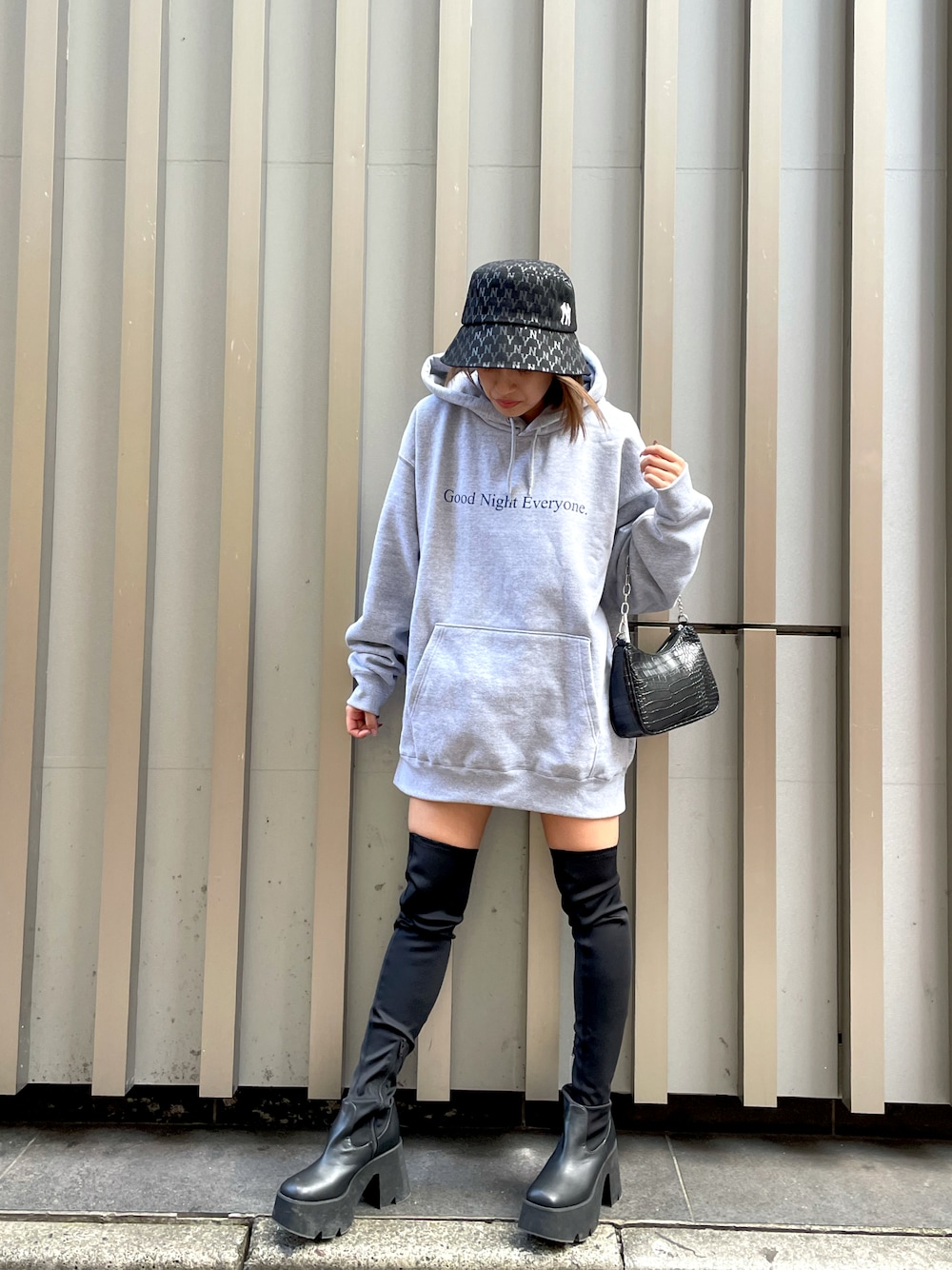 オーバーサイズのフーディにニーハイブーツ合わせの激盛れコーデ💗 ブーツはとにかく楽ちん❤️走り回れます✨ 小物は全部ブラックで統一しました🖤