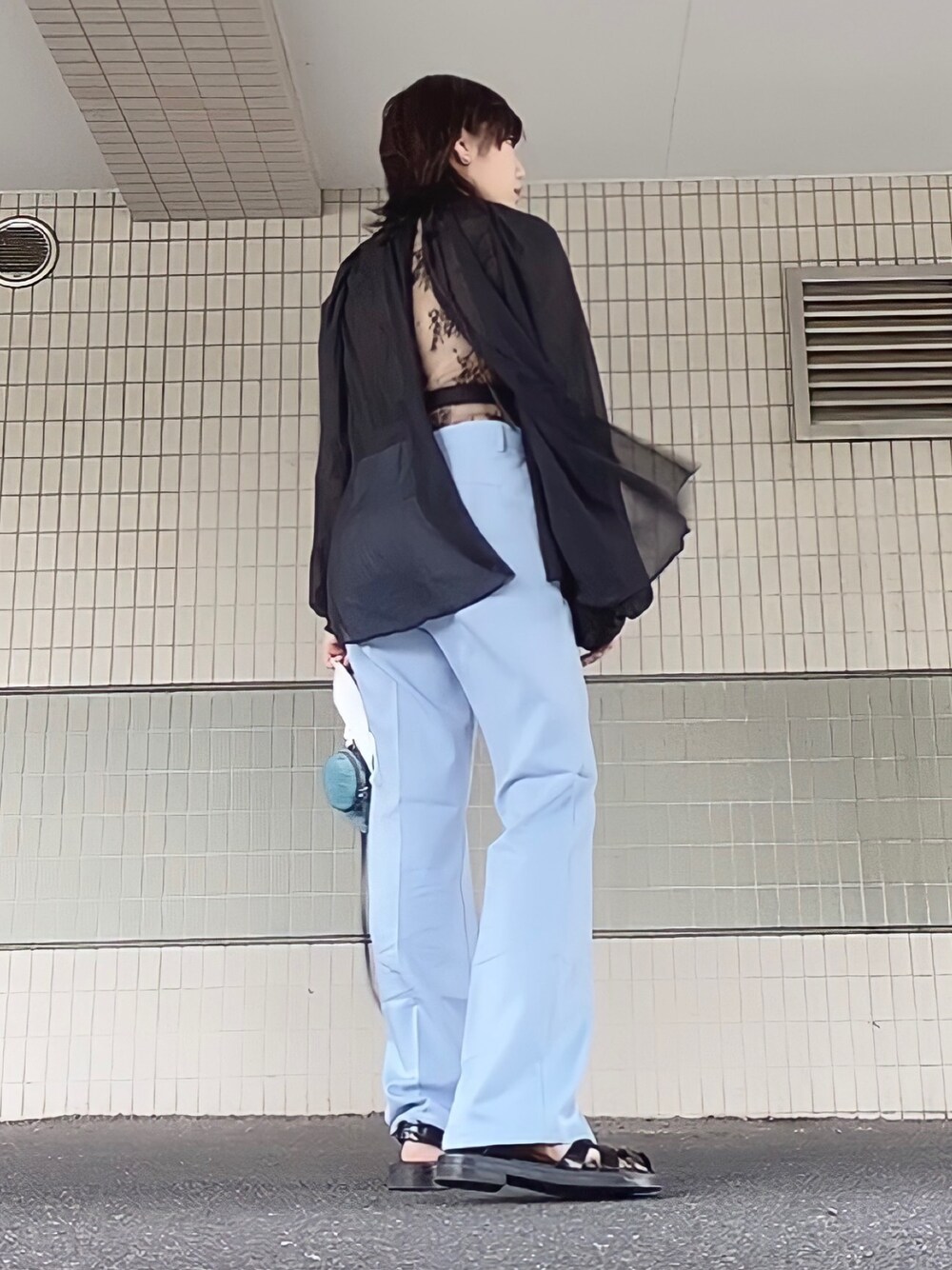 yn101のスラックス「【 足長効果あり/美脚シルエット】ハイウエストセミブーツカットセンタープレスロングスラックス」を使ったコーディネート