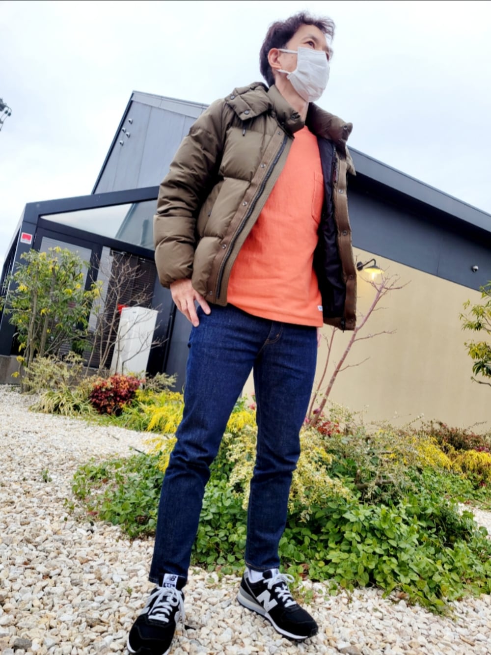 寒くなると、落ち着いた色になりがちなので、ダウンの下をオレンジT🍊にした明るいコーデにしてみました。