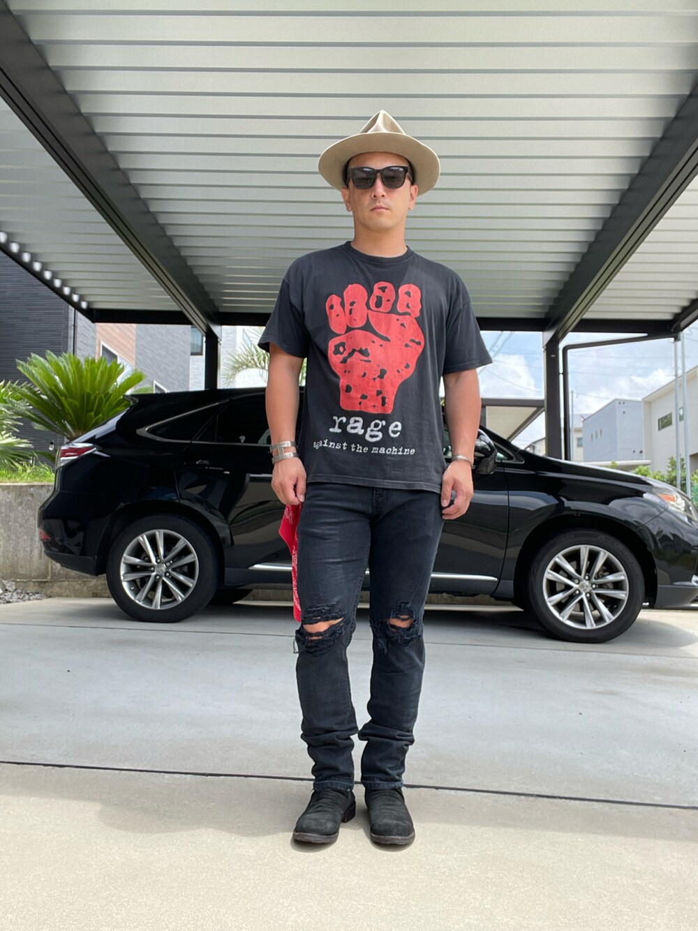 サイズは今流行りのジャスト目をチョイス👍 この時期のオールブラックだと重たくなり過ぎるのでハットやバンダナでアクセントに。
