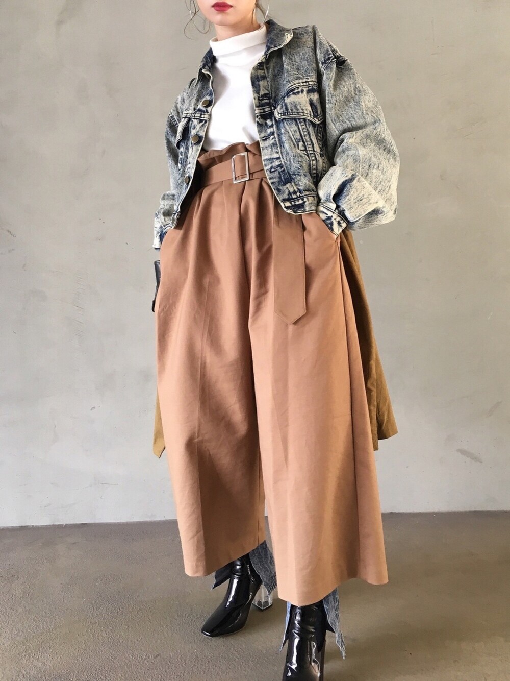 ベージュ系のパンツ、ブルー系のデニムジャケットを着用したレディースの春コーディネートの1枚目の写真