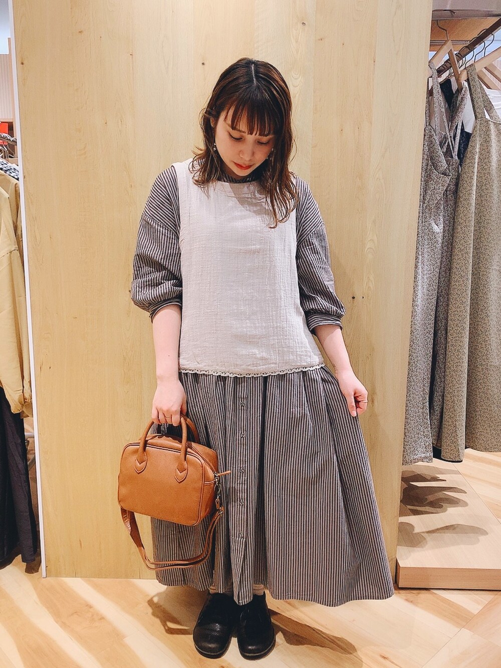 秋に大活躍しそうなベストをワンピースと合わせてみました🍂 前から見るとシンプルですが後ろが編み上げになっているので後ろ姿も可愛いです🙆🏻♀️ ワンピースは前開きなので羽織として使っていただけます!