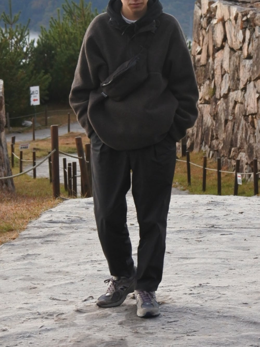 グレーとブラックでワントーン風コーデ。 アンユーのパーカーの上にグラフのフリース。足元はnb2002r