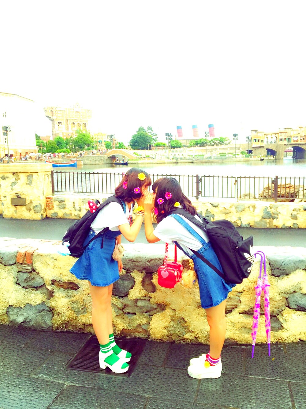 ディズニー双子コーデ第3弾! #サロペットスカート×白T×カラーソックス×白スニーカー リメイクしてつくったお花を髪につけるとかわいいです😊 ラプンツェル風にしてみました♩