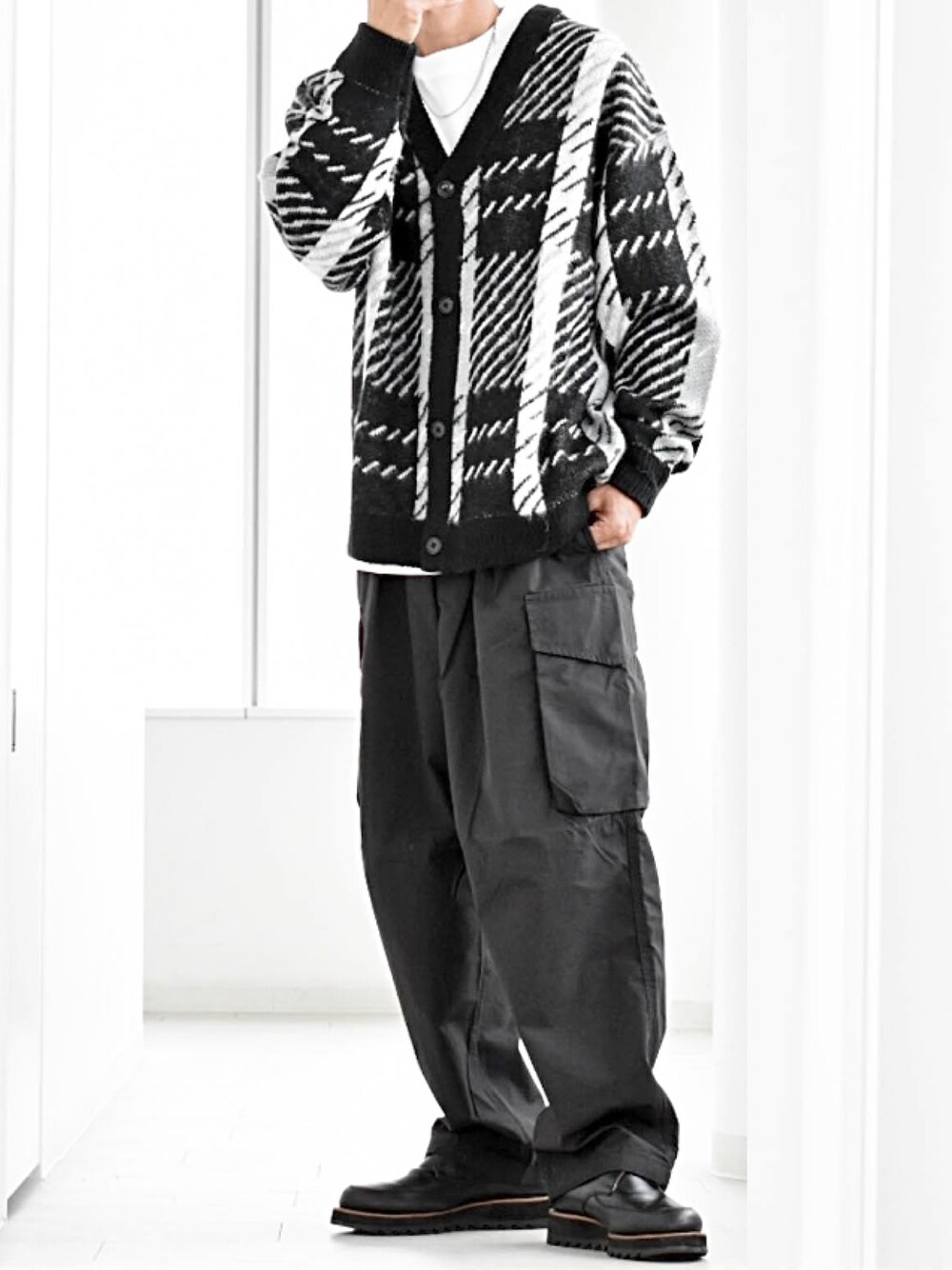 いいね お気に入り フォルダイン ありがとうございます。 本日はシャギー加工 チェック柄ニットバルーンカーディガンを使ったモノトーンコーデになります ゆったりサイズでトレンド感のあるシルエットのカーディガン。 生地の表面を「掻いて」意図的に毛羽立たせることで 古着のような風合いを出しています。 柄は大柄のチェックを採用し1着でもインナーとしても 着こなしにインパクトを与えられるアイテムです。