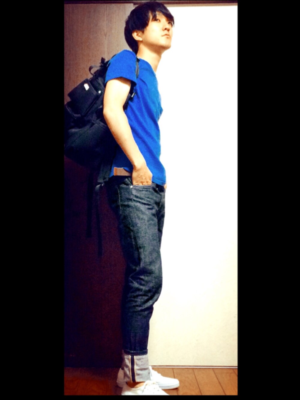 何の変哲も無い格好ですが、鮮やかな青色のTシャツを特に強調しています。素材も肉厚で、がっしりしていて気に入っています。