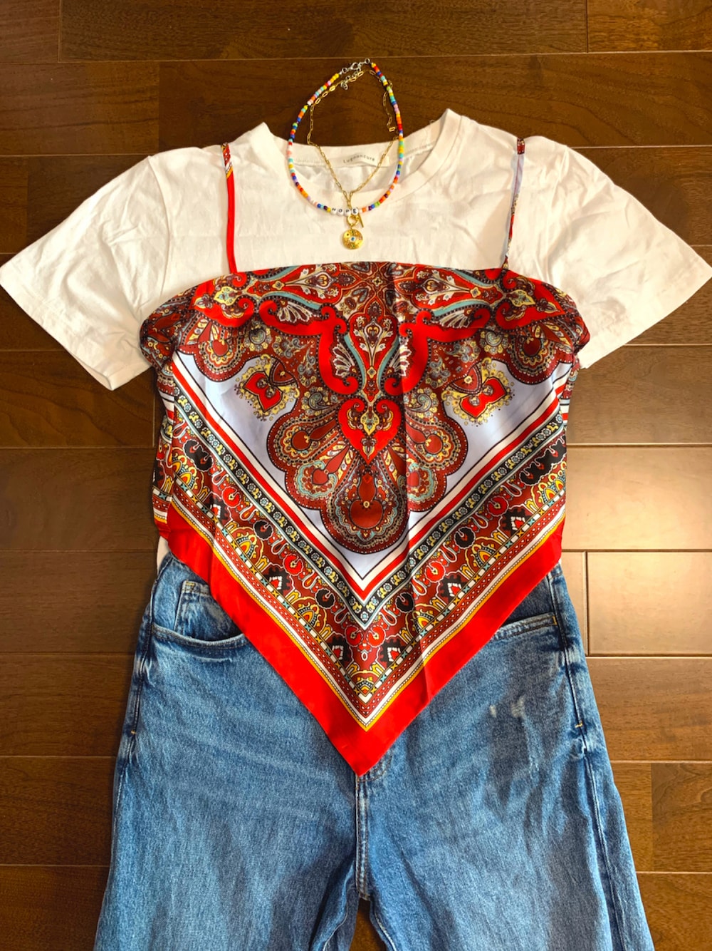 しわくちゃですみません😥 アリエクで買ったバンダナキャミが可愛かったので載せます。後ろで結ぶタイプです!