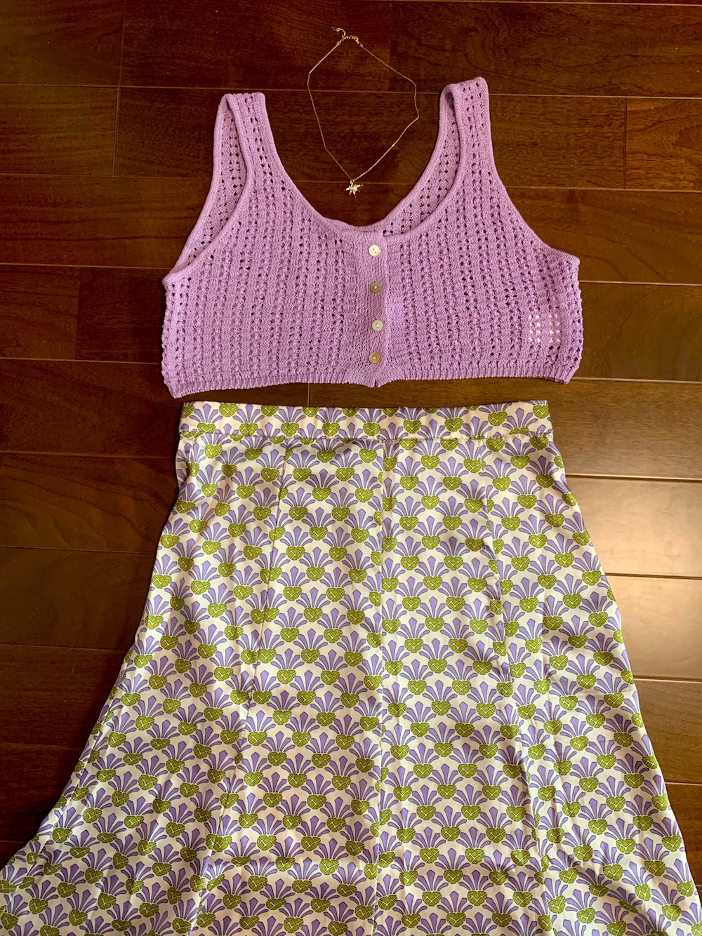 ZARAの不思議な柄のスカートに同系色のトップス着たら可愛いです🌷これ下にシャツ着るトップスだと思うんですけど、たまにはこれくらい肌見せしたい〜しないけど笑