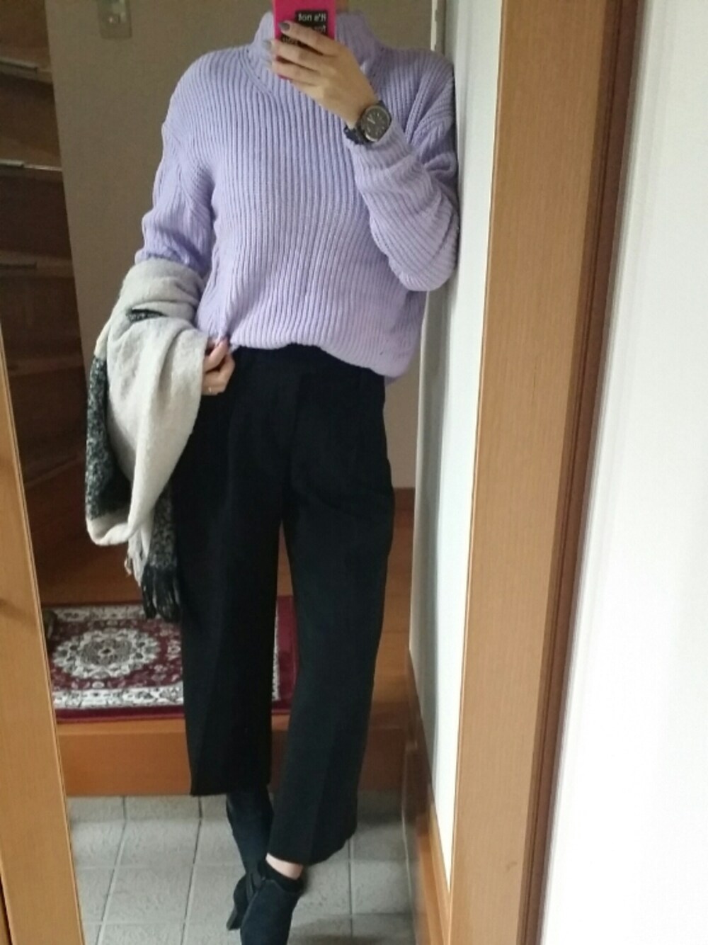 お疲れさまです (*´∀`)♪ いつもありがとうございます( ´罒`*)✧" 初めましての方これからもアップ頑張りますので宜しくお願いします(('ェ'o)┓ペコ 今日は寒かった!コート着るか悩んだ… シンプルなコーデですが、ラベンダーカラーとタートルニットでゆるい感じが可愛いです♥ ラフにならないようにスラックス履きました! 仕事の合間をみて片方だけネイルチェンジ☆゚・*:.καωαΣd(゚∀゚)Ё!! ゚.+:。 流行りにのってみましたw デザインといいミラーパウダーといい←ミラーパウダーは個人的にこんな感じでのせるとくどくないからスーキ♡♡ 今日もお疲れさまでした! 明日は久々の祝日のお休みだ♥買い物かなぁ( ´艸`)ムフフ 毎日コツコツやってるとこんな私でも♥やsave更にフォローしてくださる方がいると思うと嬉しくて毎日アップしてるw これからも繋がっていれたらと思います(*^^*) 本当はちょい悪女っぽい格好が好きなんですwロックテイストとかねw