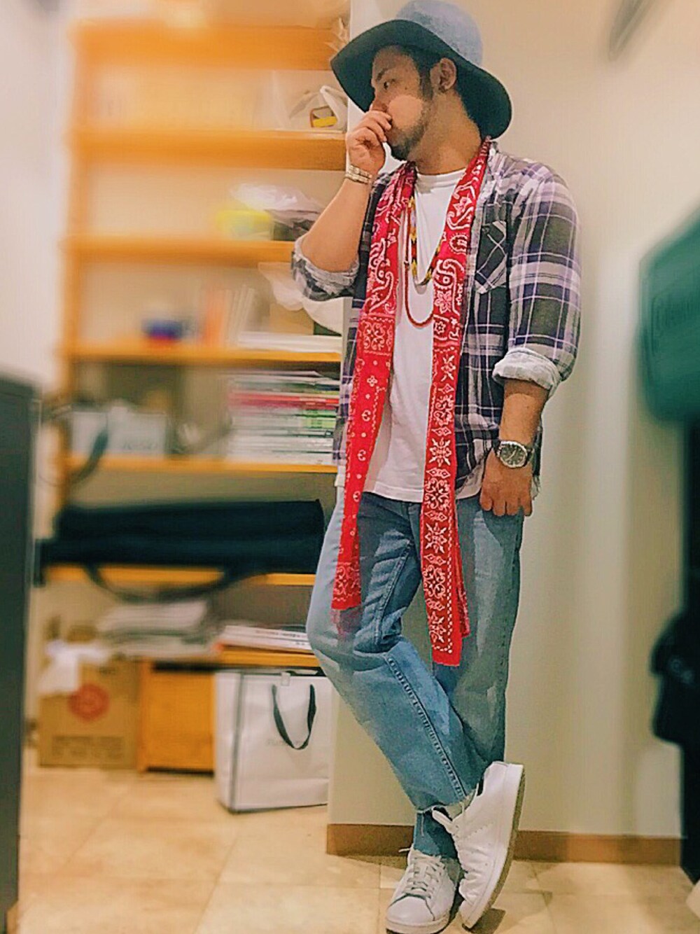 つば広ハットにネルシャツ👯👯 あ、このネルシャツリメイク物で赤の裾と襟が カットオフされてて、襟の所には何故か赤の バンダナストールが。。。 完全アメカジMIX👨🏼👨🏼👨🏼 いつもイイね❤️&SAVE&フォローなどありがと うございまする🙇🏻