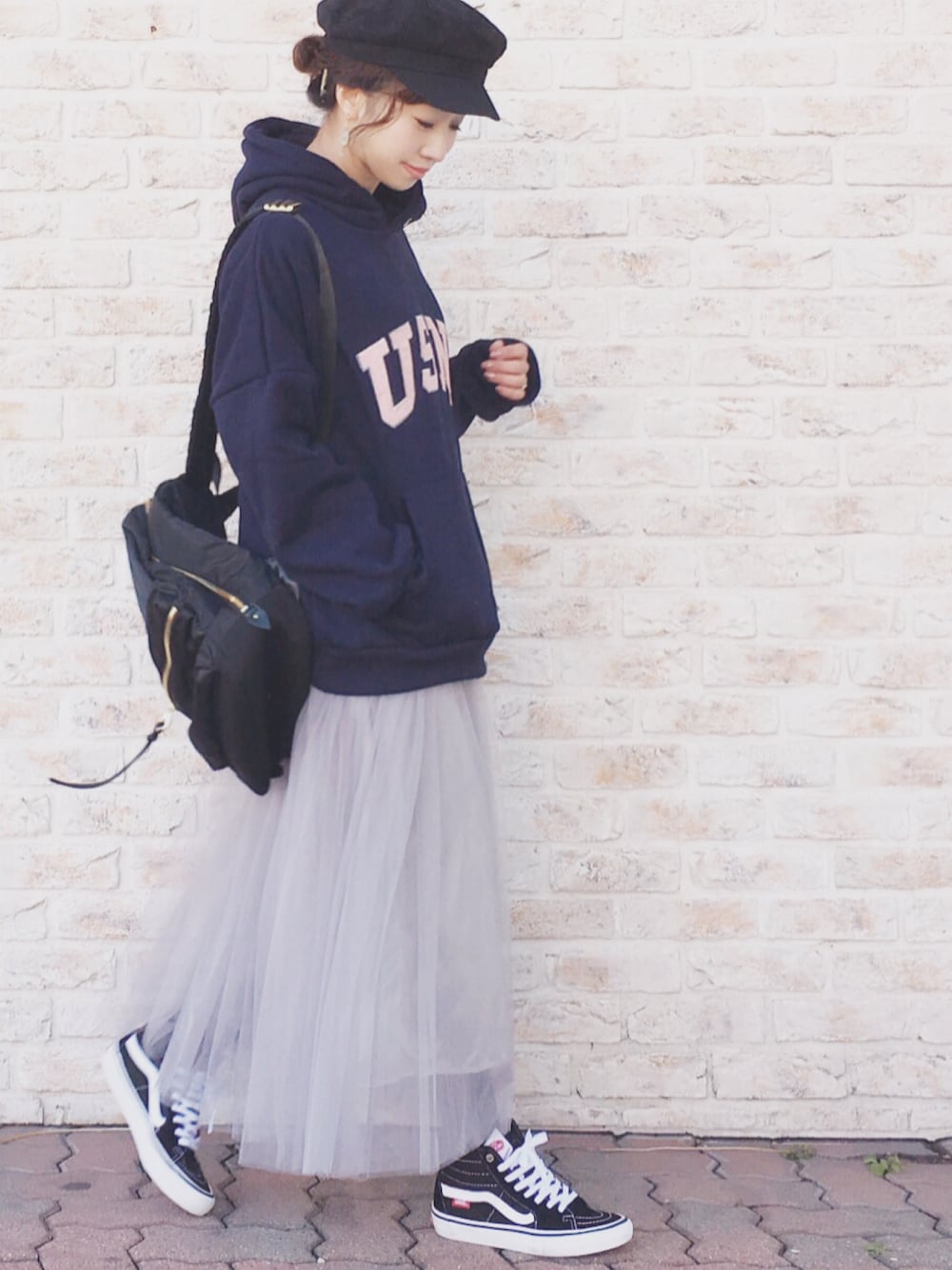 欲しかったロゴスウェットは ANDJのプチプラパーカーにしました。 チュールスカートにハマりそうです。 cocaで¥1990+TAX♡ プチプラカジュアルコーデです(^ ^)♫ パーカー/FREE スカート/FREE シューズ/22.5 インスタ/yoahiru.w