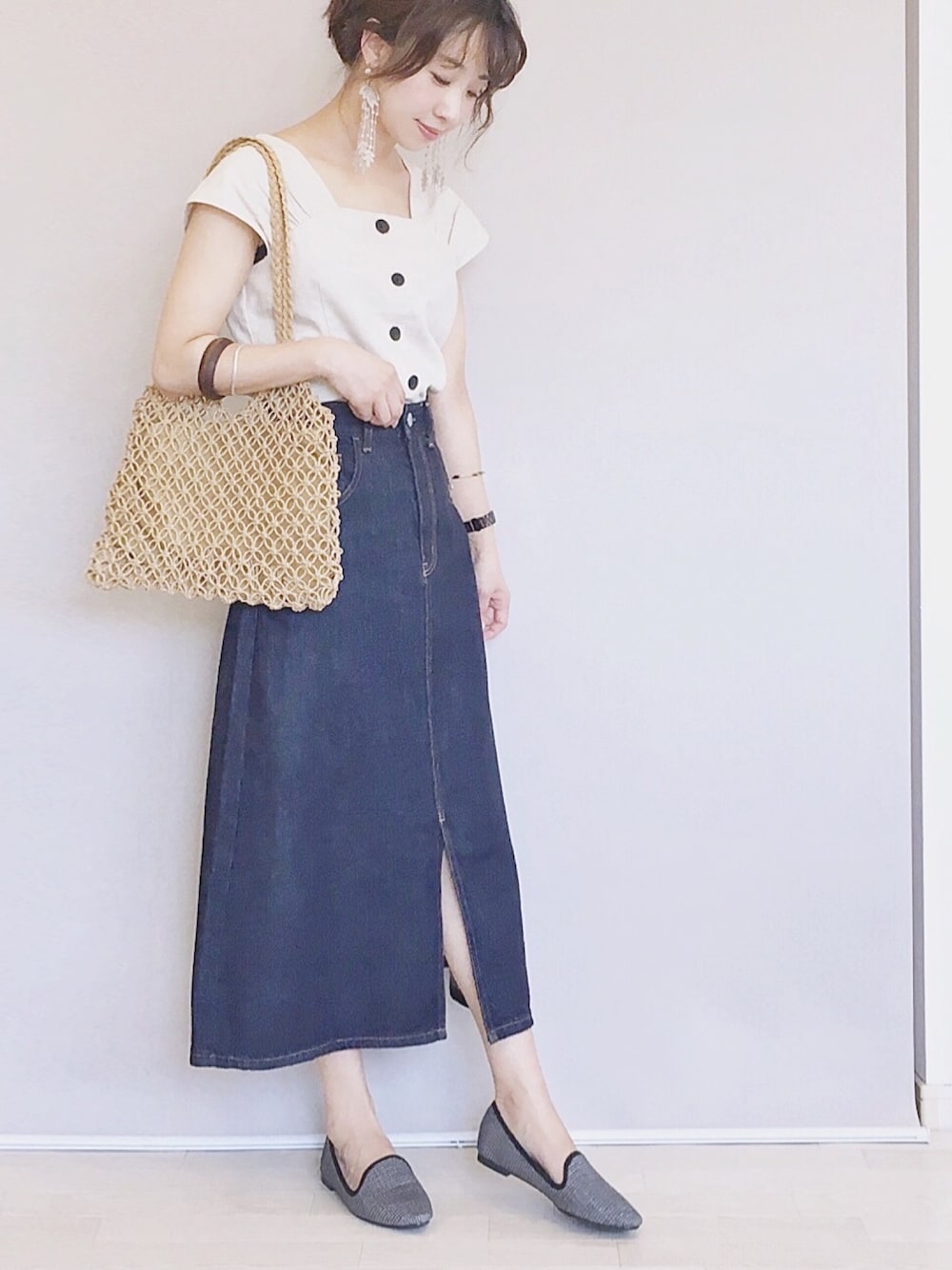 GUの新作デニムスカート シルエットとフロントスリットが可愛い☺︎♡ オペラシューズもGU✨ トップス/FREE スカート/S シューズ/S インスタ/yoahiru.w PR