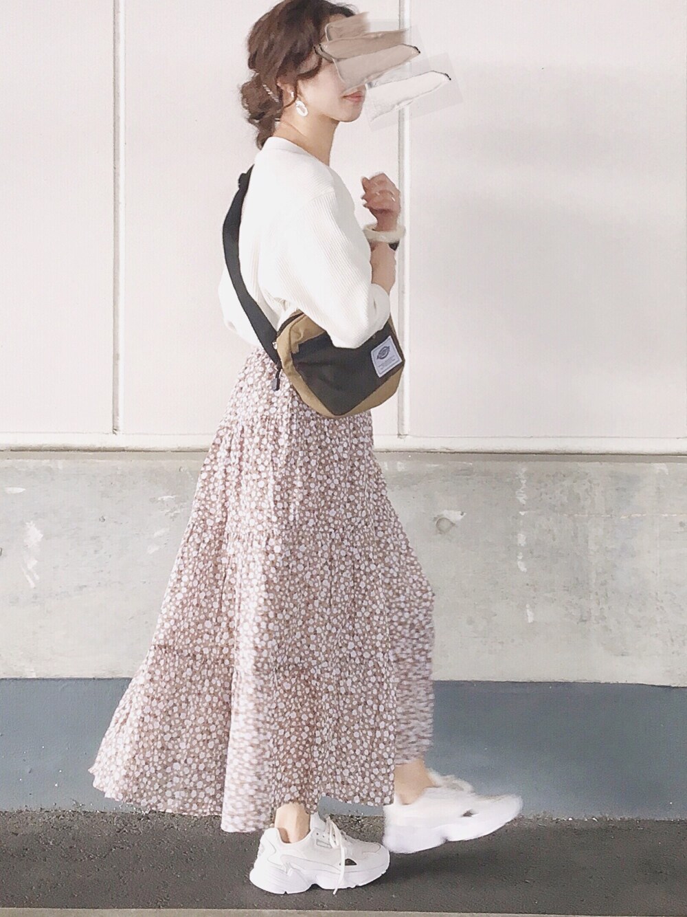 4月もよろしくお願いします☺︎✨ GUティアードスカート着回しです☺︎ シンプルにワッフルTとダッドシューズ🙈♡ ワッフルT/M スカート/S シューズ/22.5 インスタ/yoahiru.w