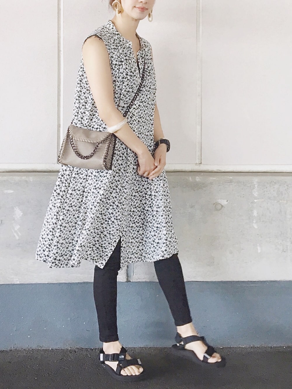 GU今週の新作 プリントギャザーロングチュニック☺︎✨ 小花柄が大人可愛い♡ 柔らかくて優しい肌触りのジョーゼット素材で ギャザーたっぷりのシルエットが素敵な一枚です♡ ブラウス/M パンツ/XS シューズ/5 インスタ/yoahiru.w
