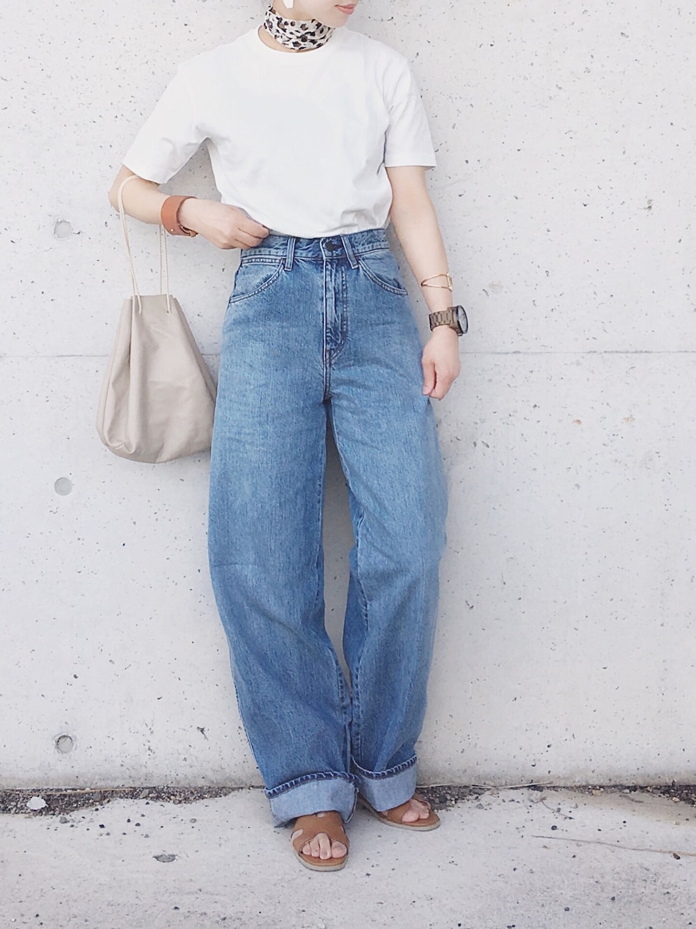 UNIQLOのハイライズワイドストレートジーンズ 薄いカラーも欲しくなってオンラインで購入☺︎✨ やっぱり白Tは外せない、 と期間限定価格のTシャツもGET☺︎♡ 小物はブラウン系。 トップス/S デニム/23 シューズ/S インスタ/yoahiru.w