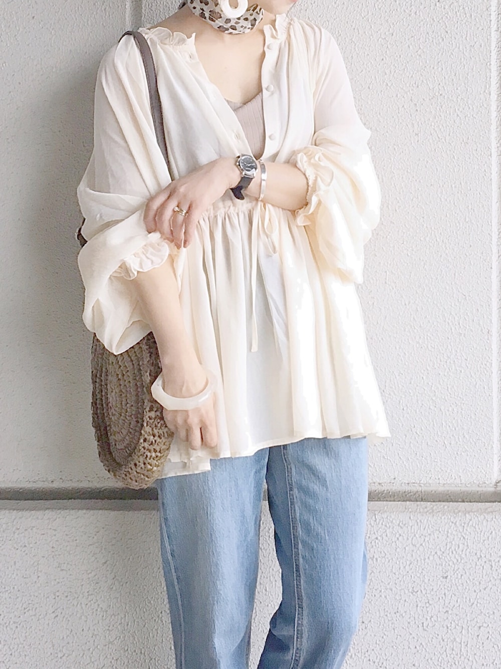 陽のシャツ/ブラウス「ハイネックボリュームギャザーブラウス」を使ったコーディネート