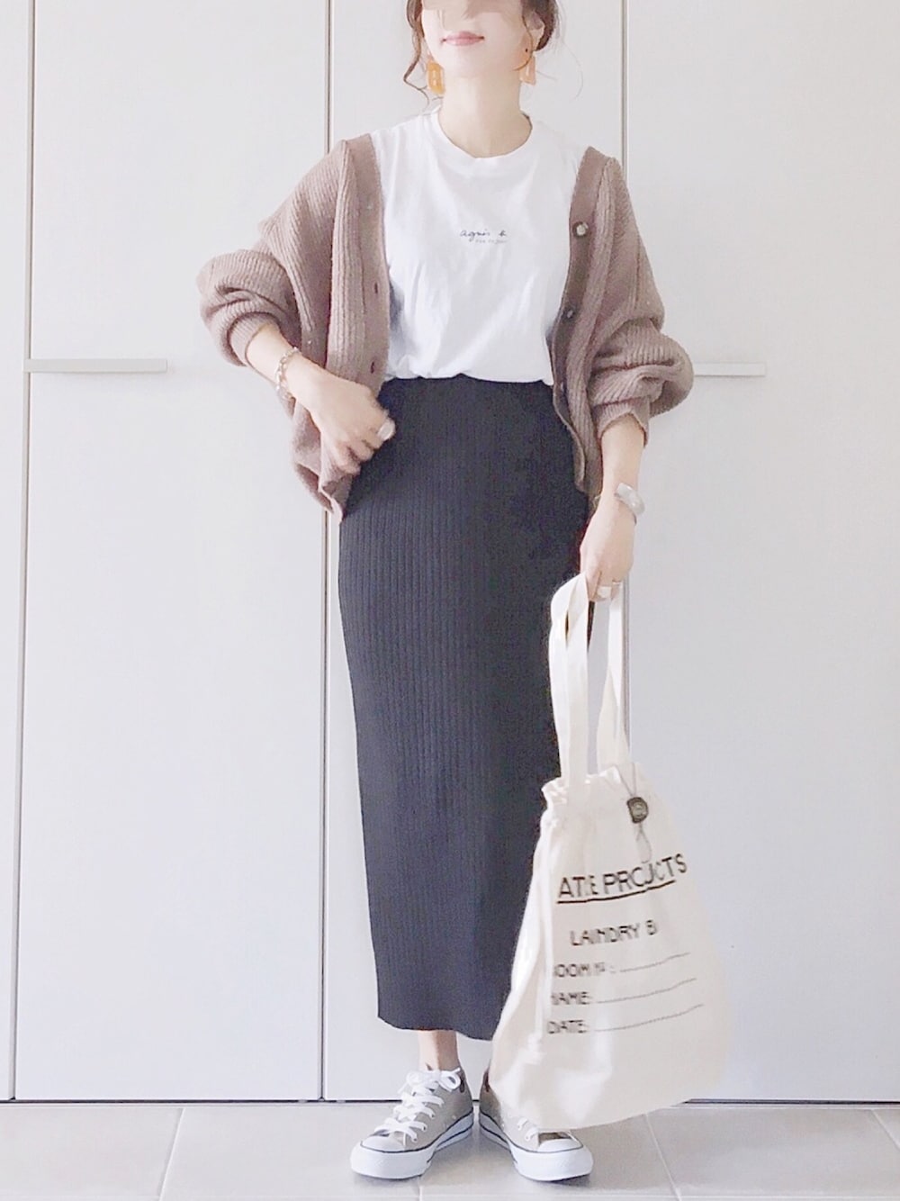 GUのドルマンカーデ ワイドリブニットスカートと相性いい☺︎♡ Tシャツ/3 カーディガン/L スカート/S シューズ/22.5 Instagram/yoahiru.w