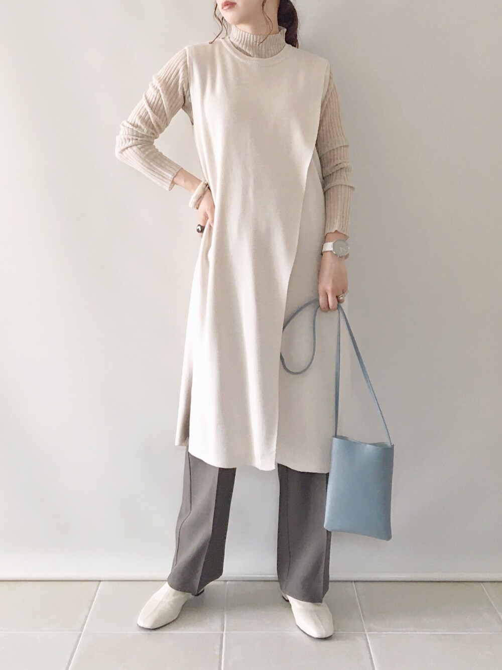 陽のベスト「レイヤードスリットロングニットベスト」を使ったコーディネート
