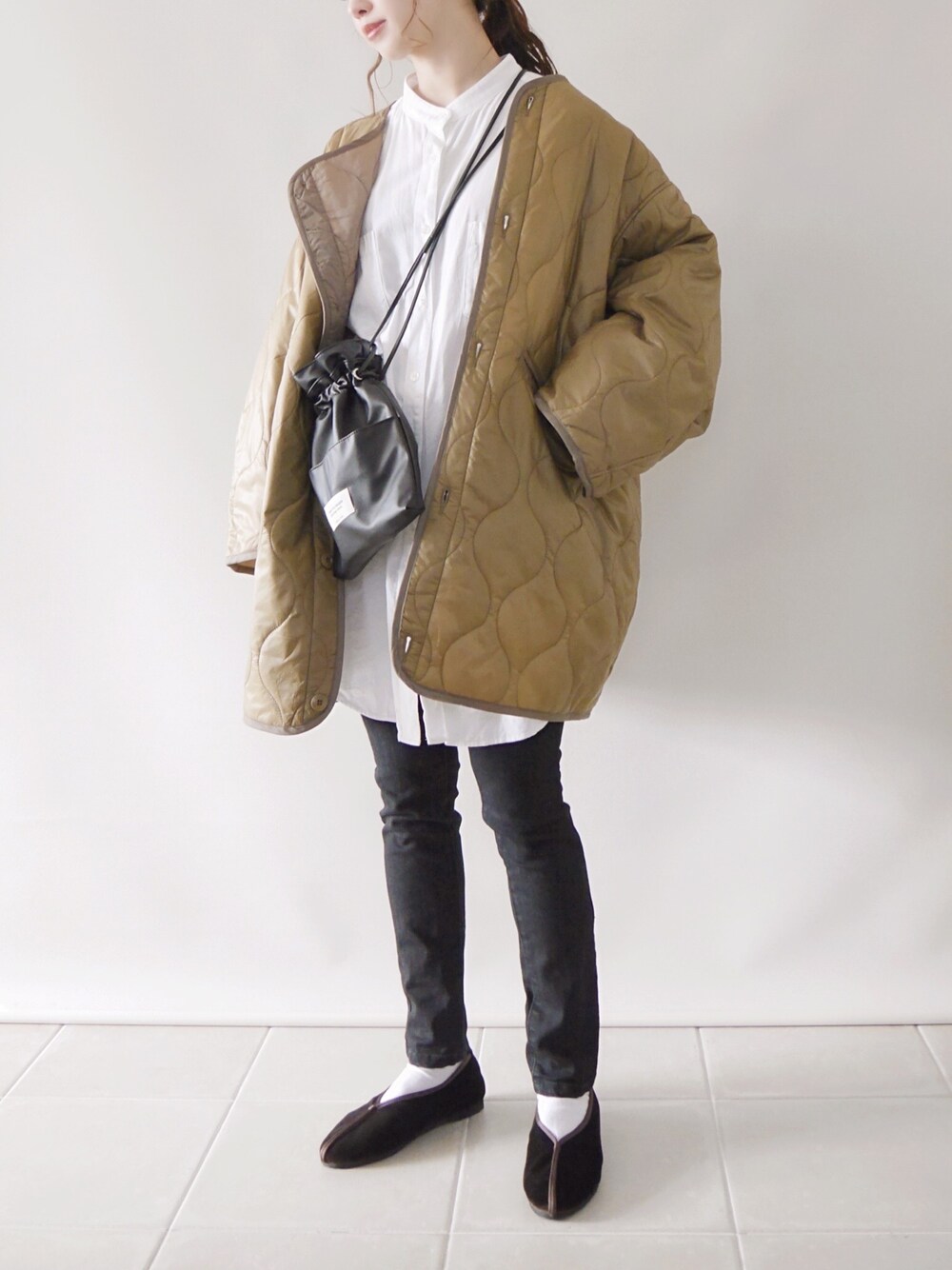 陽のノーカラージャケット「【WEB限定】M65ライナーキルトコート(キルティングジャケット・ノーカラーコート)」を使ったコーディネート