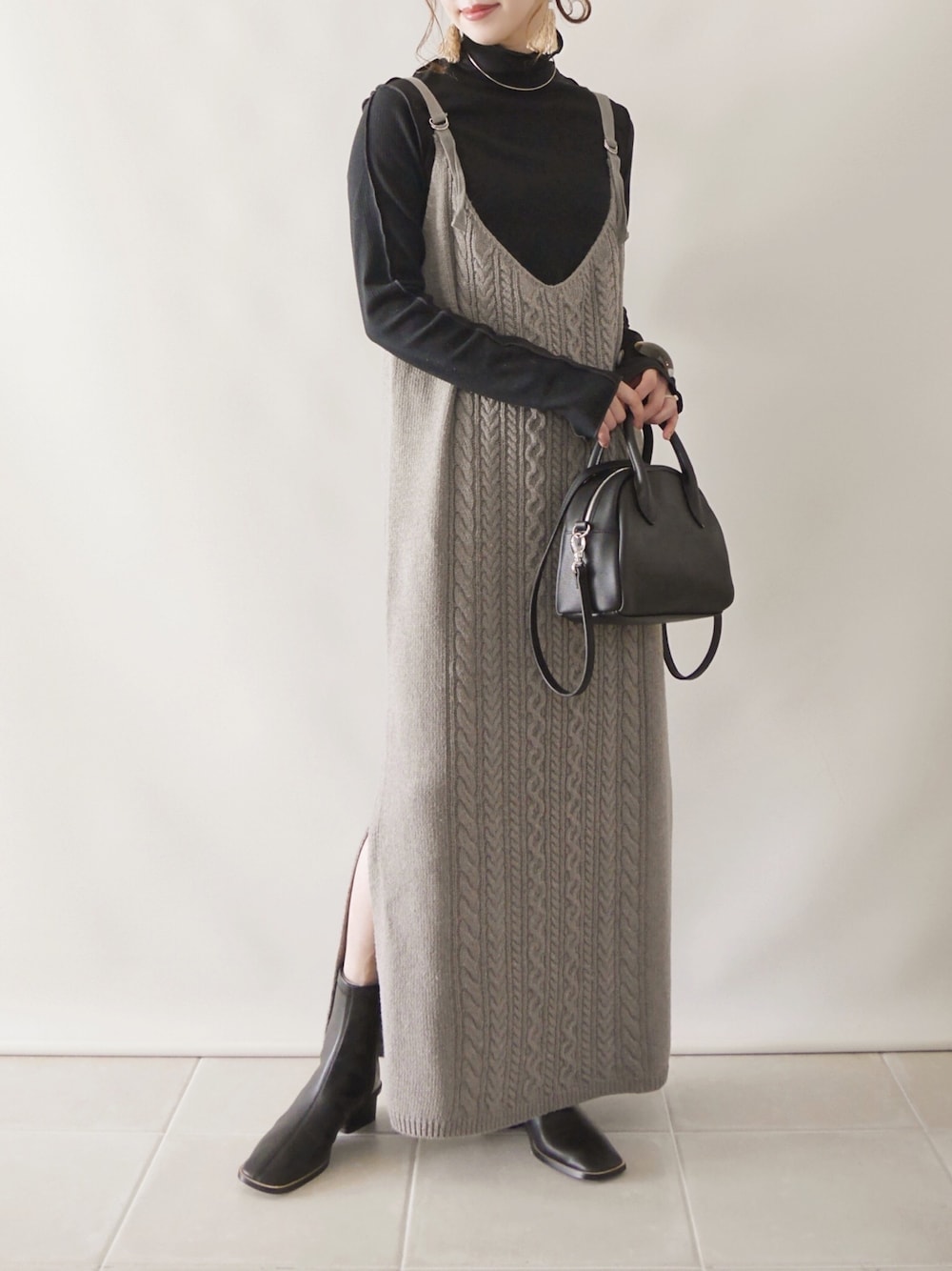 陽のワンピース「ケーブルニットキャミワンピース」を使ったコーディネート