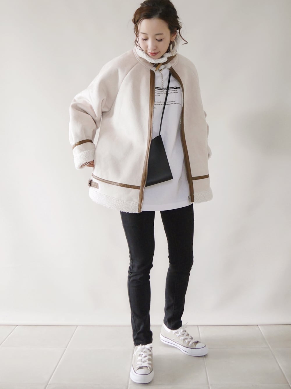 陽のムートンコート「【累計販売枚数3万枚突破!】スエード×ボアフェイクムートンB-3ジャケットブルゾン」を使ったコーディネート