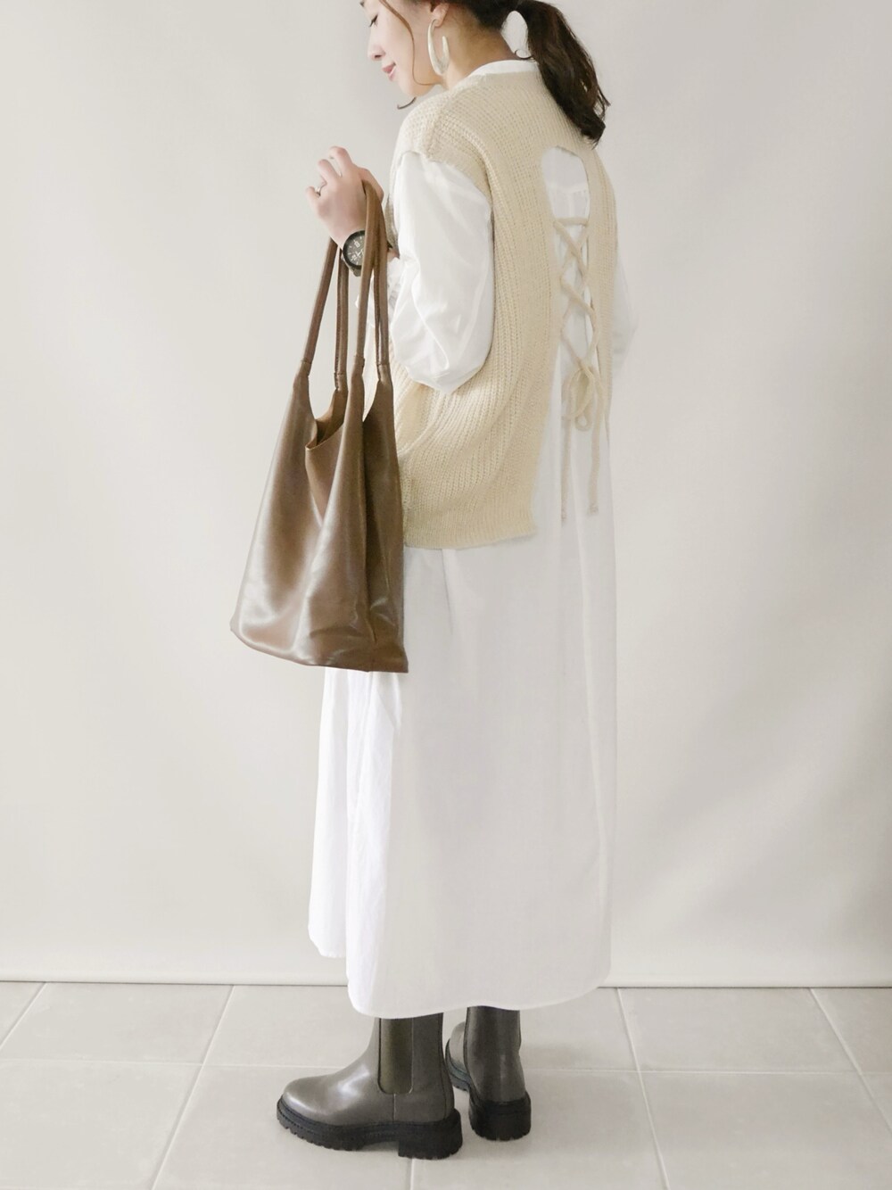 白ワンピースにCrisp yoursのニットベスト♡ バックレースアップが可愛い✨ 秋のレイヤードスタイルにおすすめ🥰 本日¥1000クーポンDayです♡ ワンピース/M ベスト/FREE シューズ/22.5 Instagram/yoahiru.w
