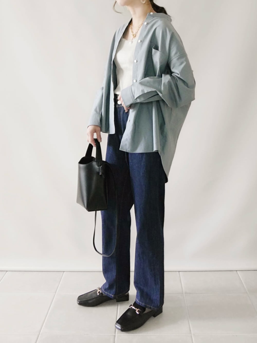 アメホリコーデ♡ 綿オックスシャツがカジュアル秋コーデに ぴったり✨ シャツ/M タンクトップ/L デニム/S シューズ/S Instagram/yoahiru.w