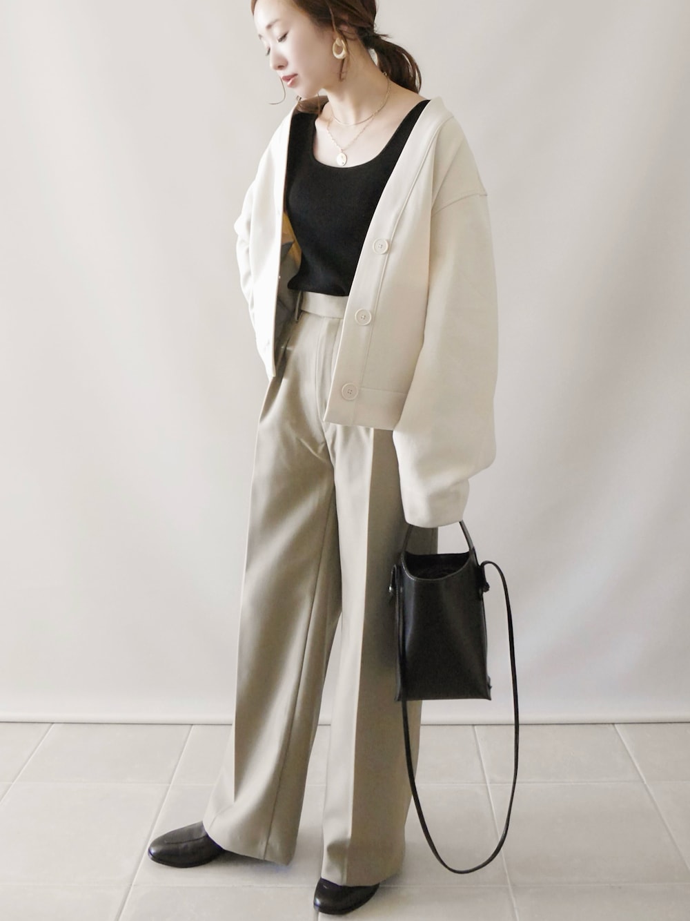 上下UNIQLO Uのお気に入りコーデ✨ スウェットカーデのシルエット良すぎです。 ベージュ×黒 大好きです☺︎ カーデ/M タンクトップ/L パンツ/55 シューズ/35 Instagram/yoahiru.w