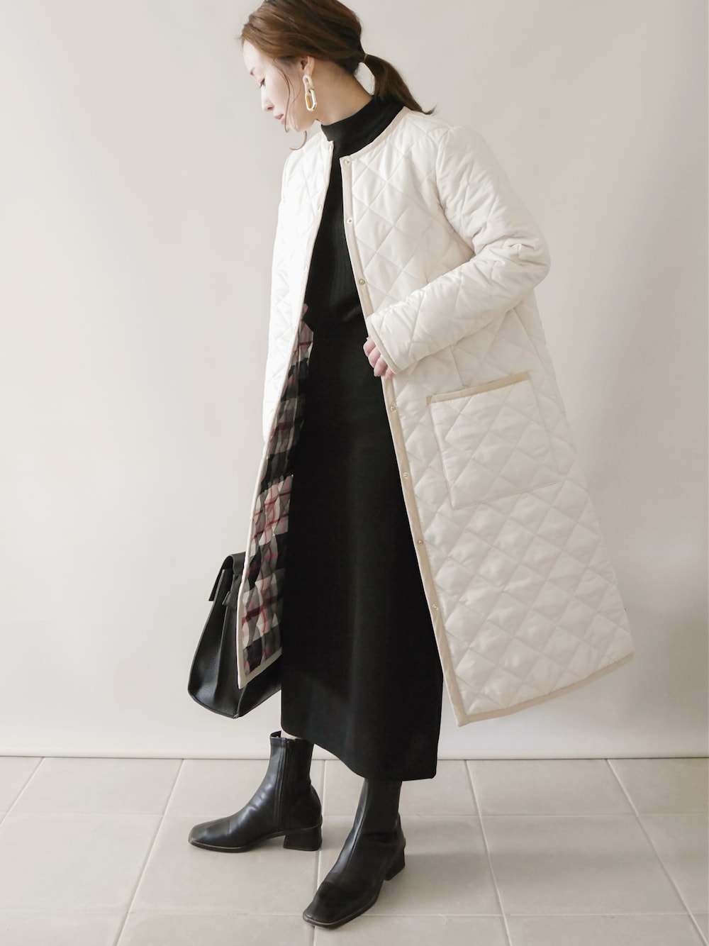 キルティングノーカラーコート シックな黒コーデで大人っぽく✨ コート/36 ニット/L スカート/M シューズ/36 Instagram/yoahiru.w