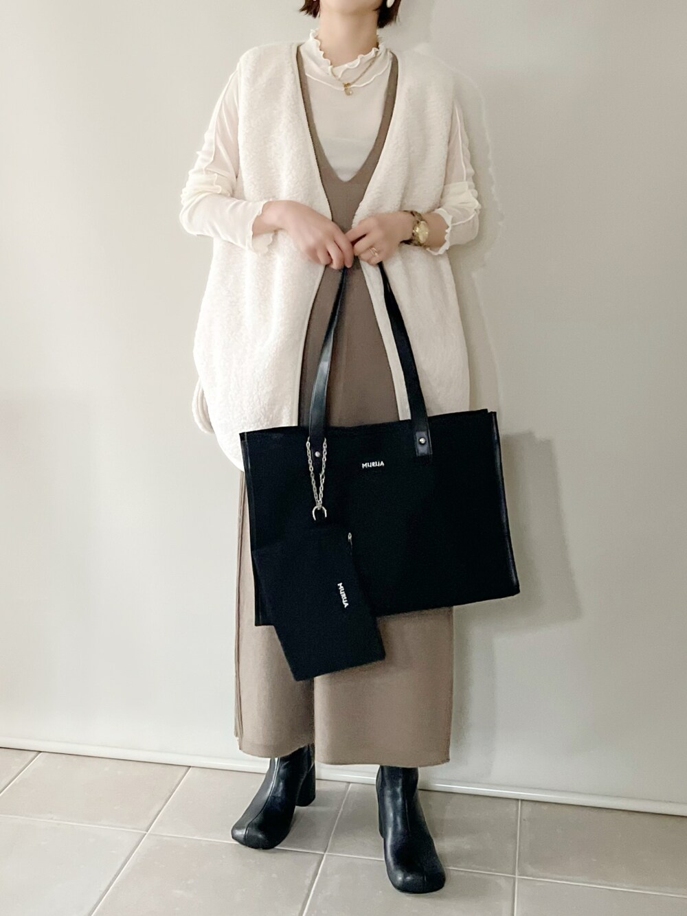 MURUAのトートバッグがとっても人気です✨ キャンバス生地にパイピングやポーチ付き♡ 仕事にもおすすめの大きさです✨ ショップ内タイムセールです♡ ベスト/M ワンピース/L インナー/L シューズ/36 Instagram/yoahiru.w