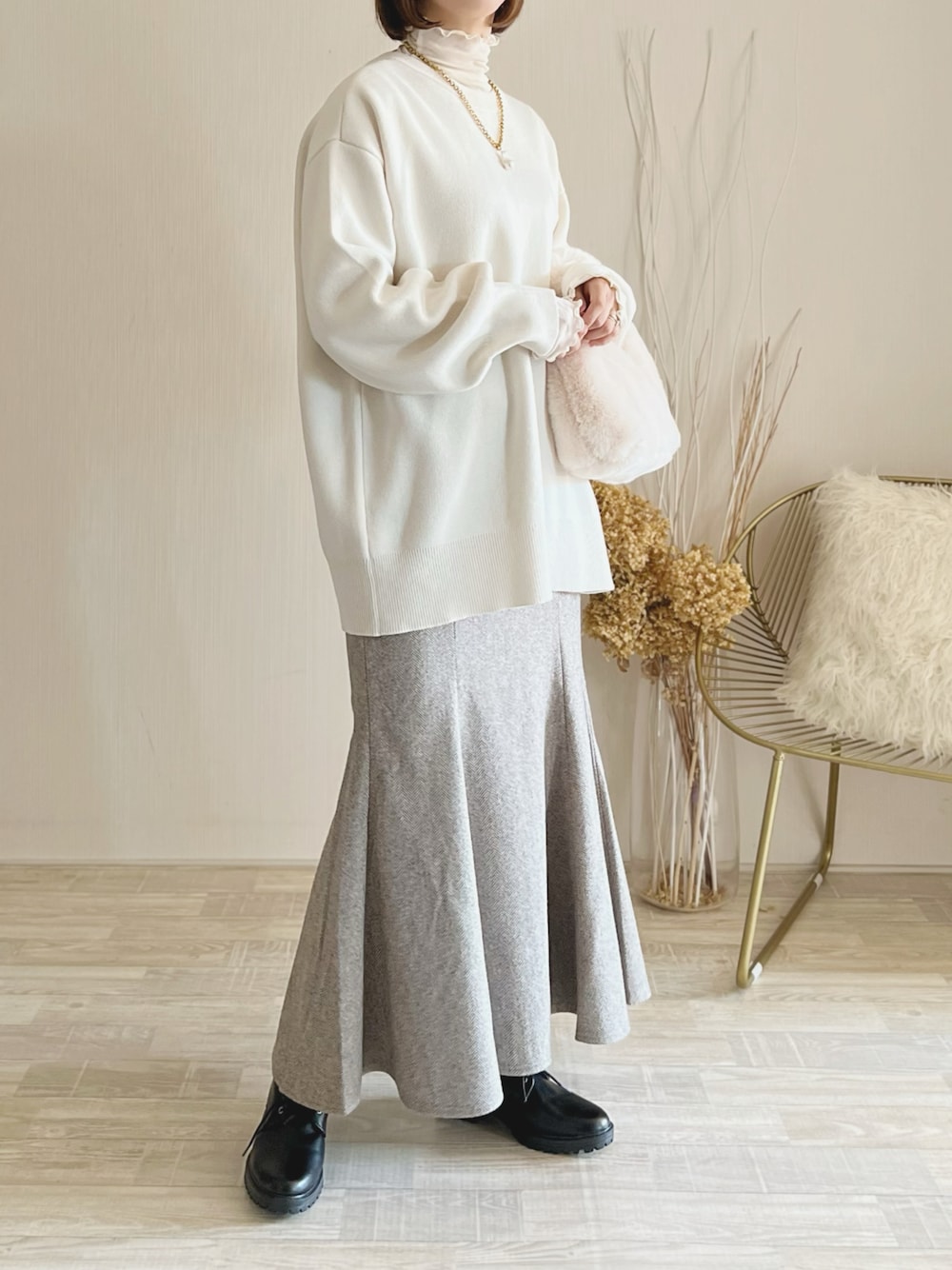 GUのマーメイドスカート、 シルエットとても良い✨ ヘリンボーン生地も可愛い𖧷 カーディガン/L インナー/FREE スカート/M シューズ/L Instagram/yoahiru.w