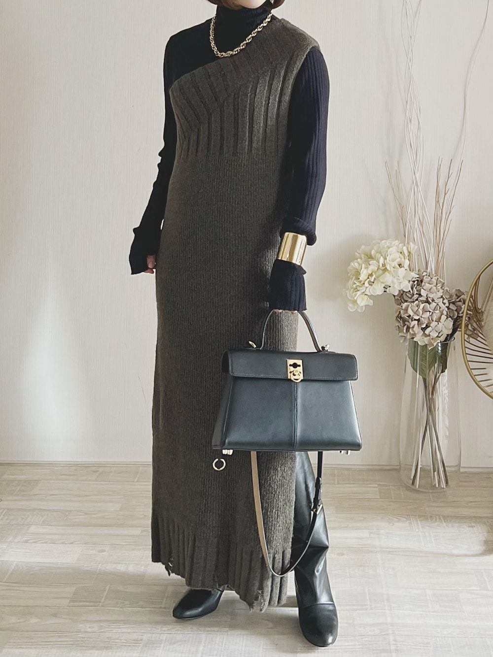 陽のワンピース「【LA PEAU DE GEM】アシンメトリーニットワンピース」を使ったコーディネート