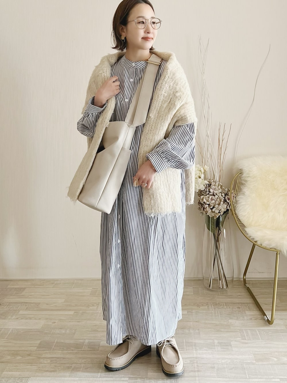 このコーデめちゃお気に入り♡♡ メガネめちゃ好評です✨ シャツワンピース/M カーディガン/FREE シューズ/M Instagram/yoahiru.w