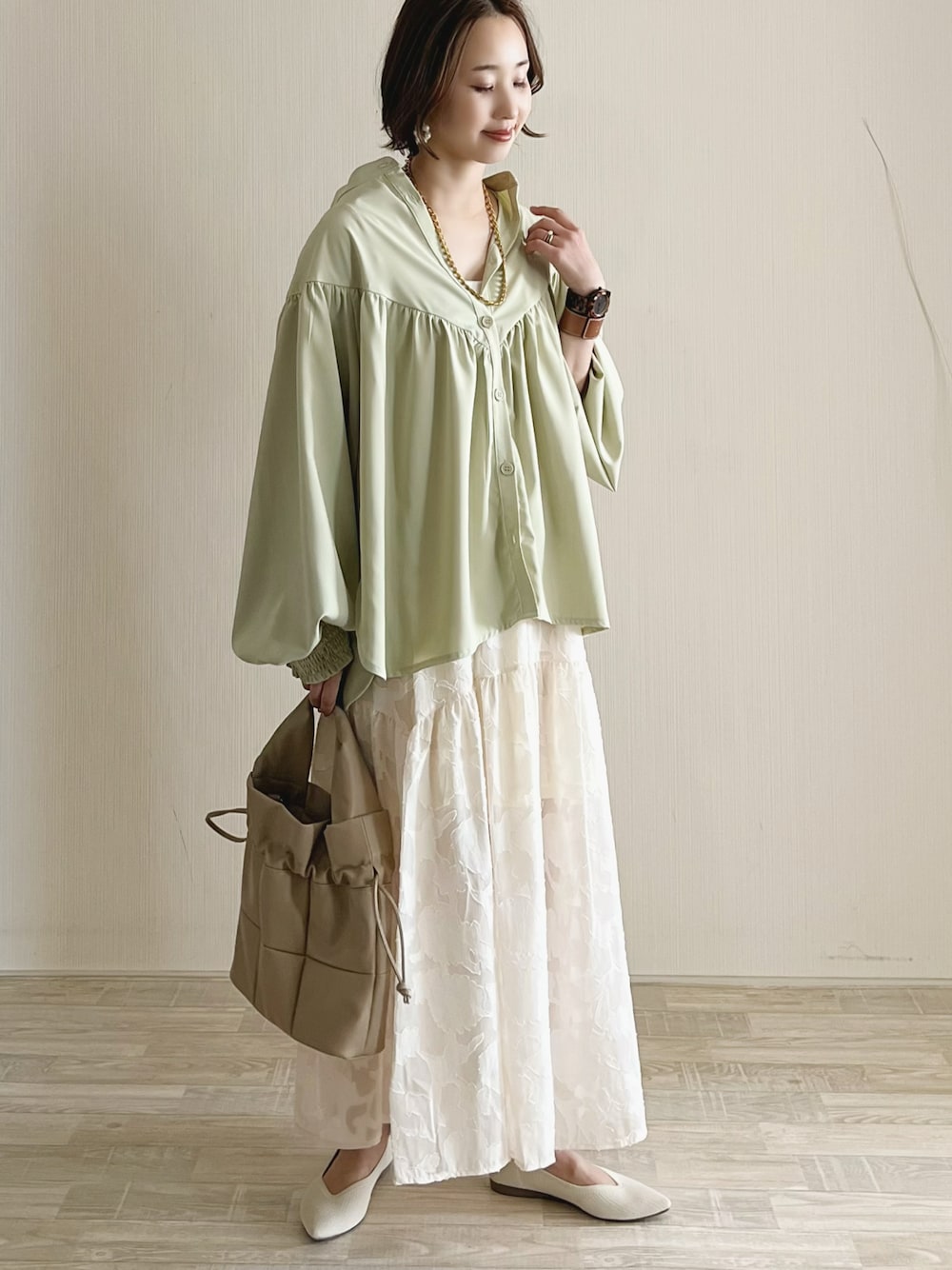 sakishimatokyoのジャガードスカート 春ブラウスで着回し♡ 本日¥1000クーポンDayです✨ ブラウス/M スカート/M シューズ/S Instagram/yoahiru.w