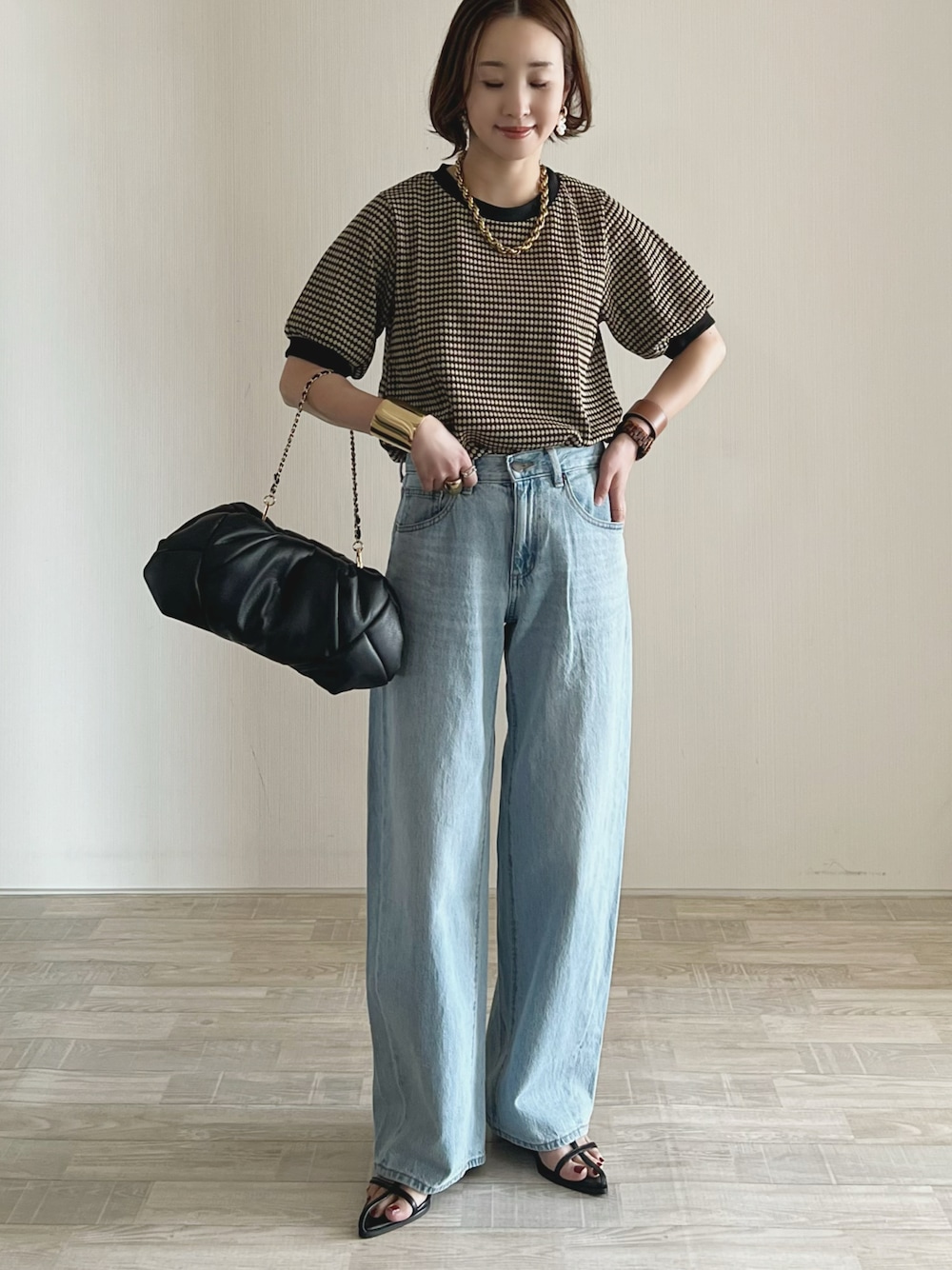 陽のTシャツ/カットソー「レトロムードな夏の1枚。ハニカム柄ジャガードニットソー」を使ったコーディネート