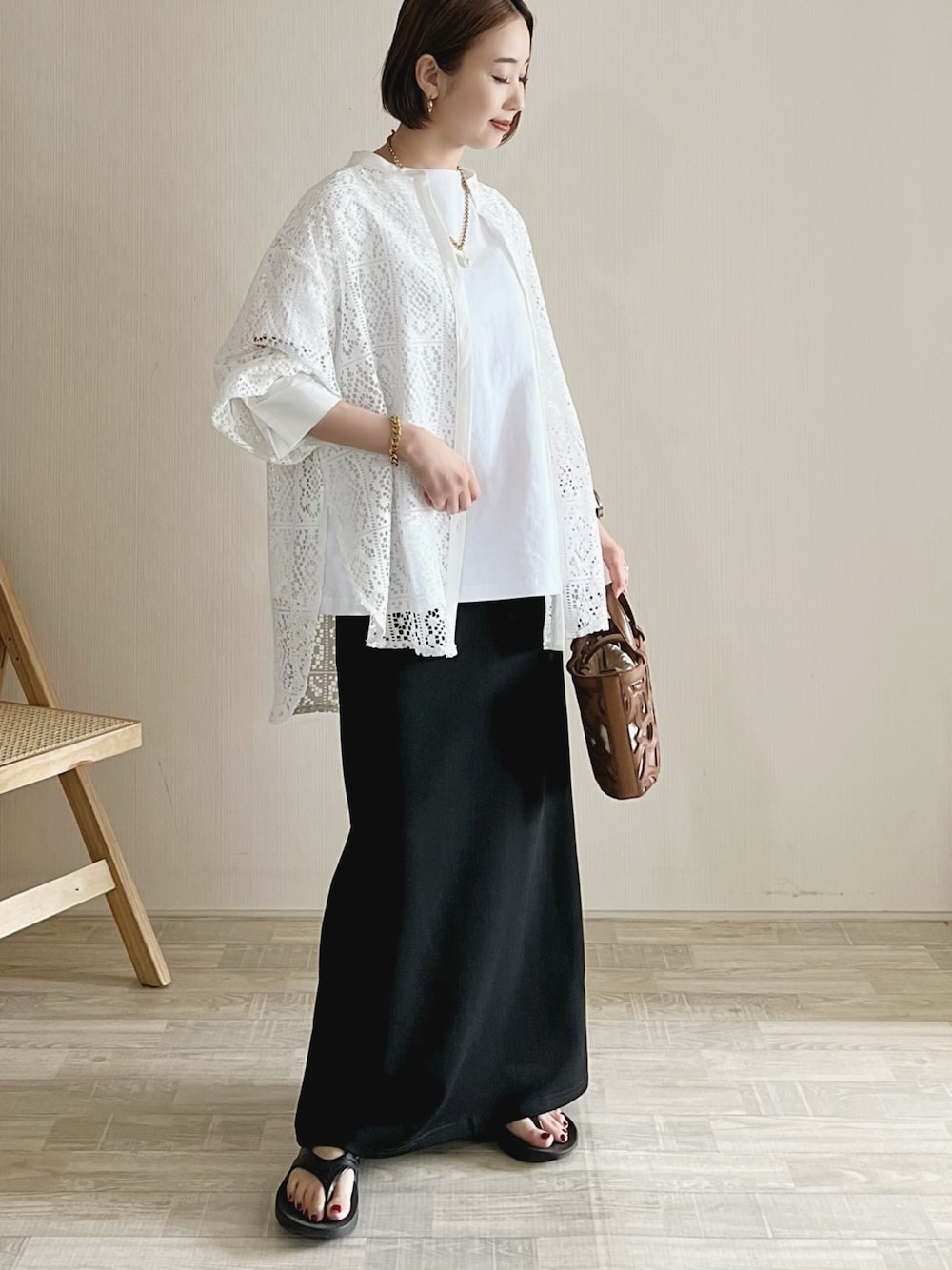 シンプルTにレースシャツを羽織り𖧷 白×白が良い感じ✨ Tシャツ/FREE シャツ/FREE スカート/FREE シューズ/5 Instagram/yoahiru.w