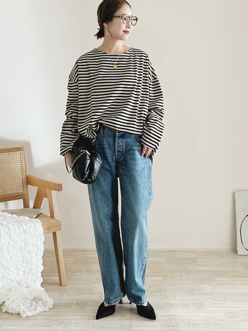 ITEMS URBAN RESEARCHのボーダーカットソーがめちゃ可愛いです♡ ゆるっと着られるオーバーサイズ✨ デニムコーデめちゃ可愛い♡ トップス/FREE デニム/24 シューズ/22.5 Instagram / yoahiru.w 156cm/ブルベ夏/骨格ナチュラル×ストレートmix