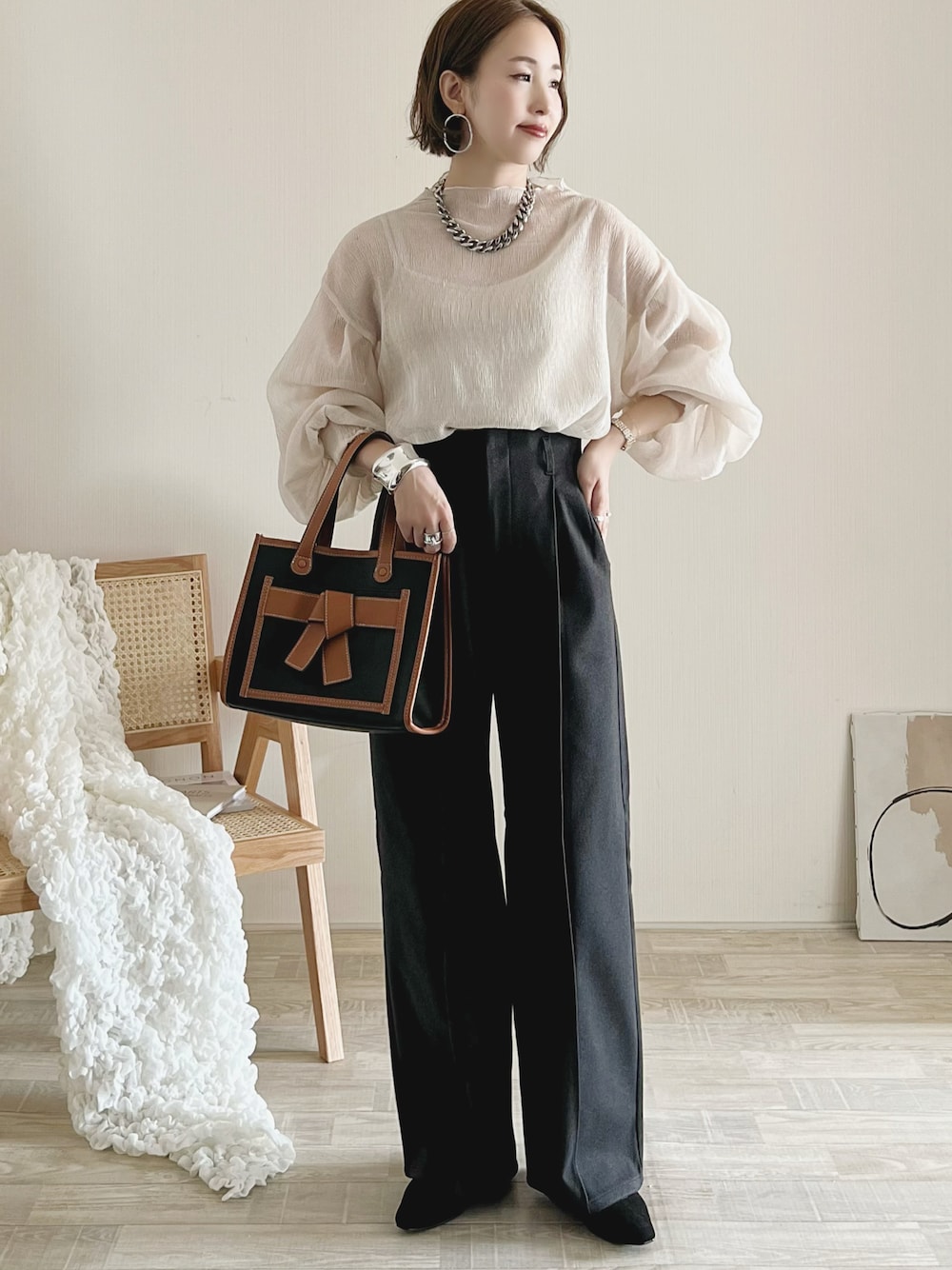 GUのブラッシュドジャージーワイドパンツ、 シルエットきれいです✨ ブラウス/FREE パンツ/S シューズ/S Instagram / yoahiru.w 156cm/ブルベ夏/骨格ナチュラル×ストレートmix