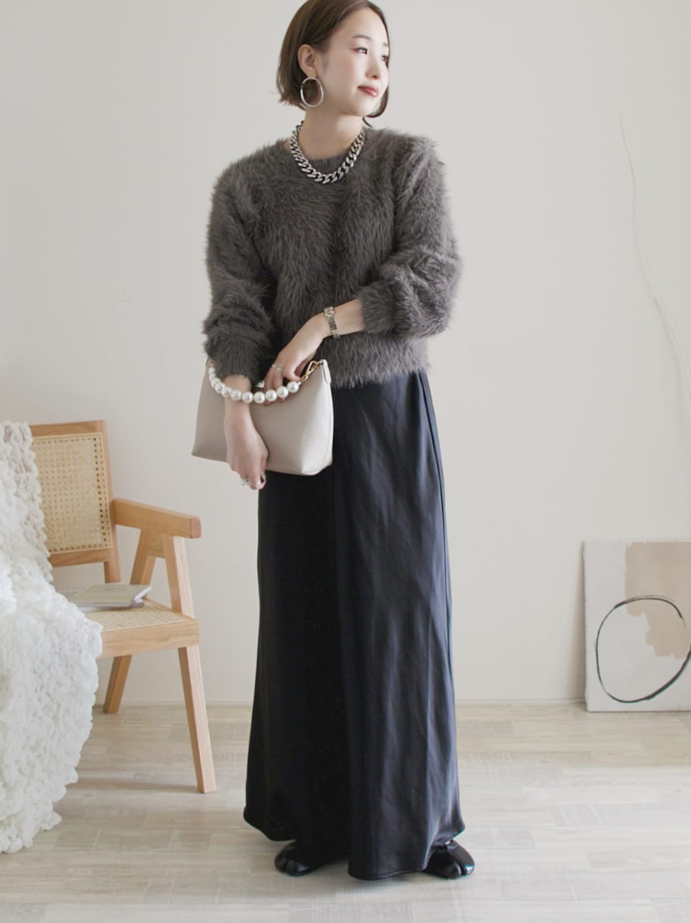 着用コーデ:79件SENSE OF PLACEのフェザーセーター ふわふわフェザーでめちゃ可愛いです♡ 肌触りもここちよい✨ コンパクトなシルエットでボトムスを選ばす、トレンドコーデが叶います𖧷 ニット/FREE スカート/L シューズ/S Instagram / yoahiru.w 156cm/ブルベ夏/骨格ナチュラル×ストレートmix