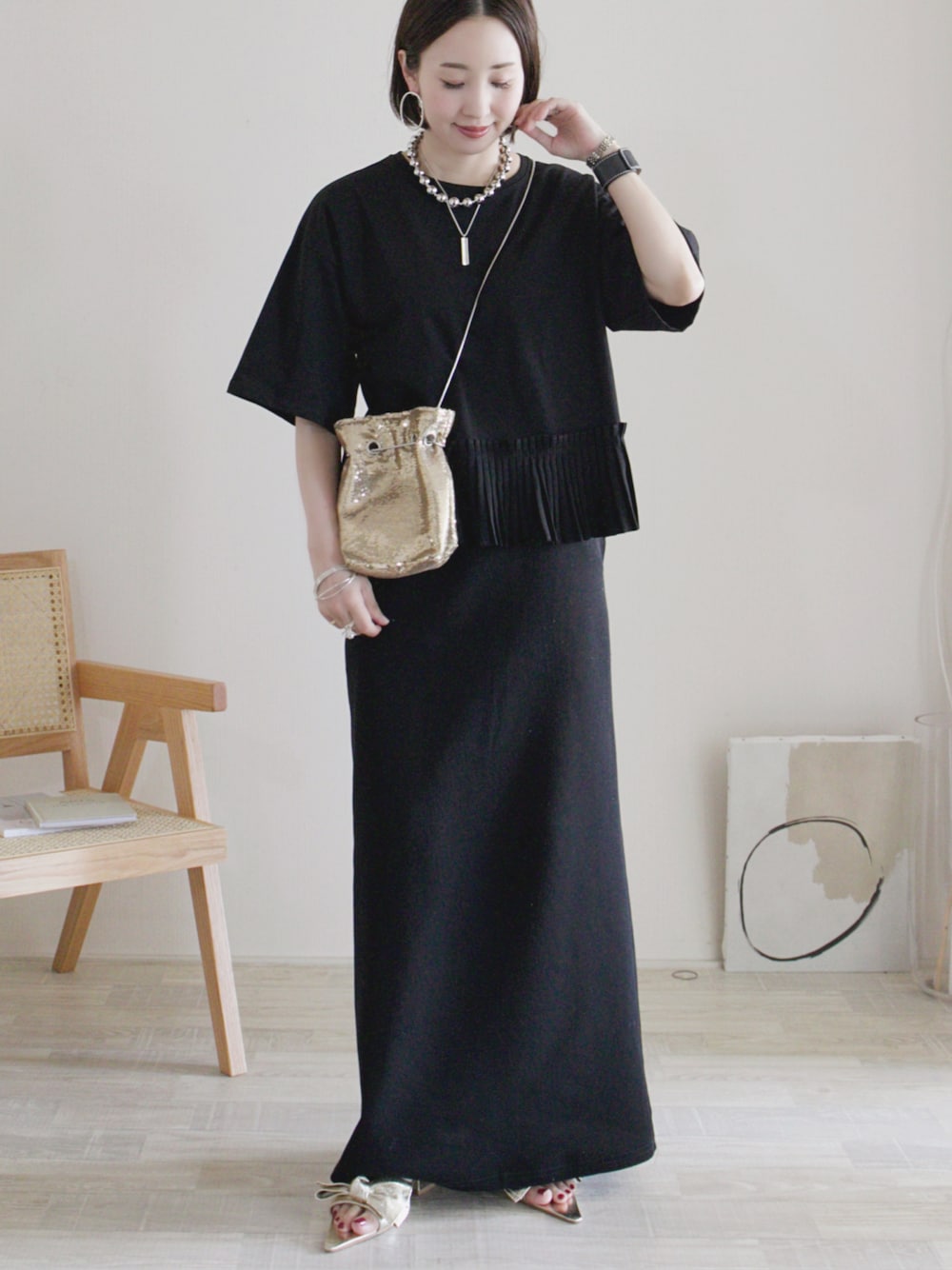 ブラックにゴールドの差し色✨ トップス/38 スカート/FREE シューズ/S Instagram / yoahiru.w 156cm/ブルベ夏/骨格ナチュラル×ストレートmix