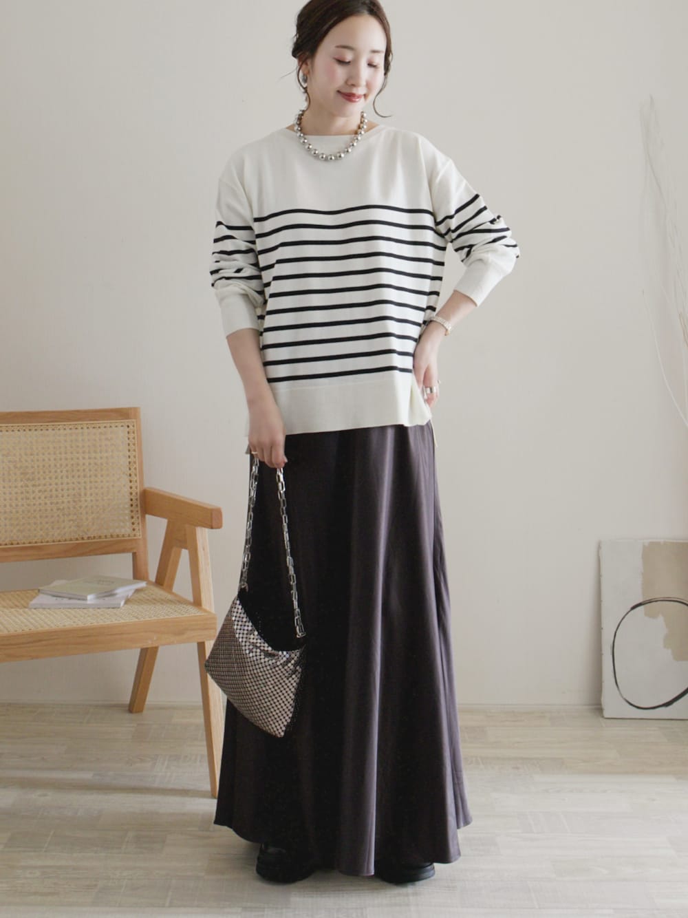 OPAQUE.CLIPのボーダーニット ボートネックがきれいで、さらりと着られる生地感が◎です✨ ニット/38 スカート/FREE シューズ/35 Instagram / yoahiru.w 156cm/ブルベ夏/骨格ナチュラル×ストレートmix