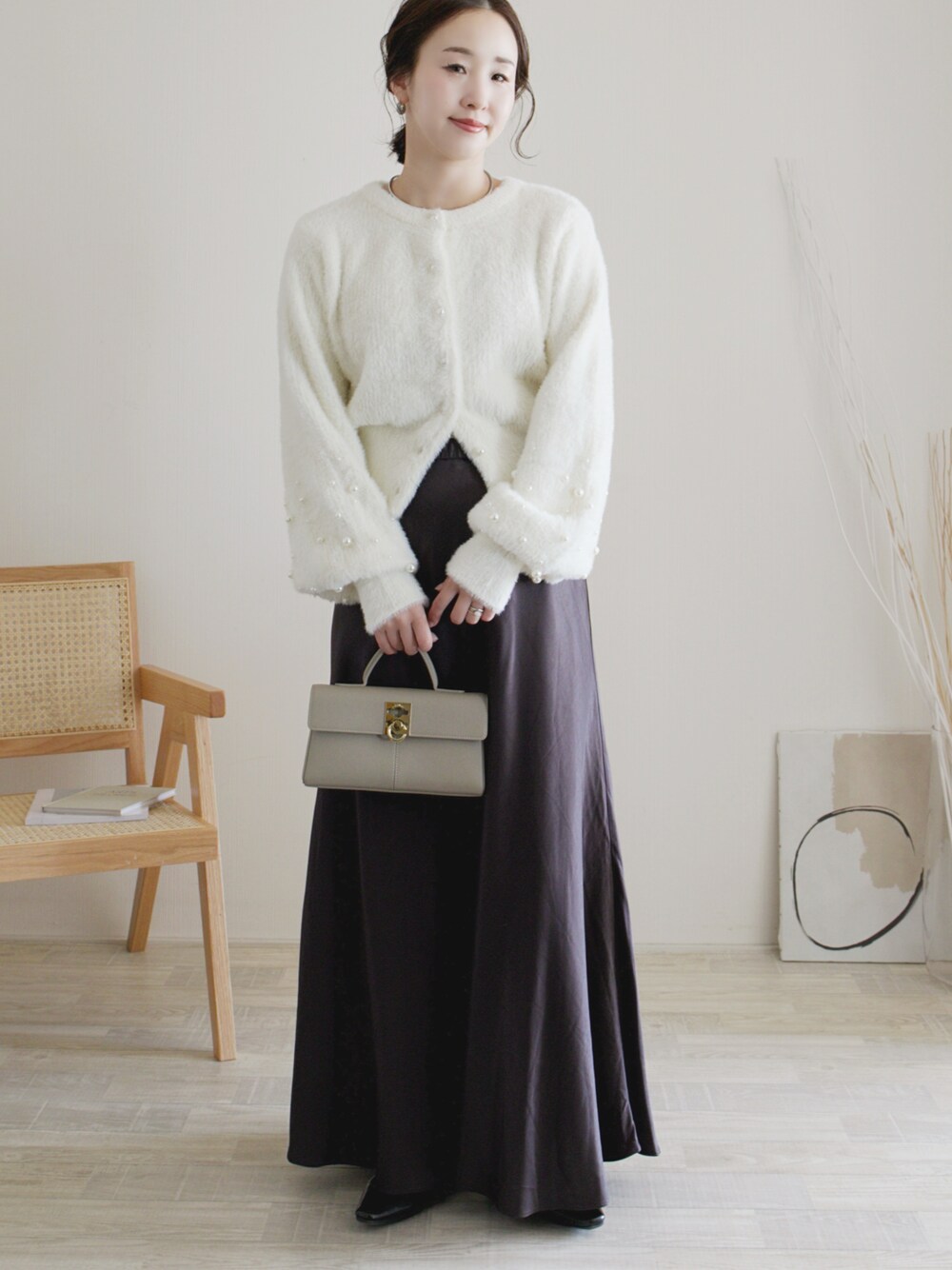 ぽわん袖にパールが可愛いニットカーディガン♡ ニット/FREE スカート/FREE シューズ/22 Instagram / yoahiru.w 156cm/ブルベ夏/骨格ナチュラル×ストレートmix