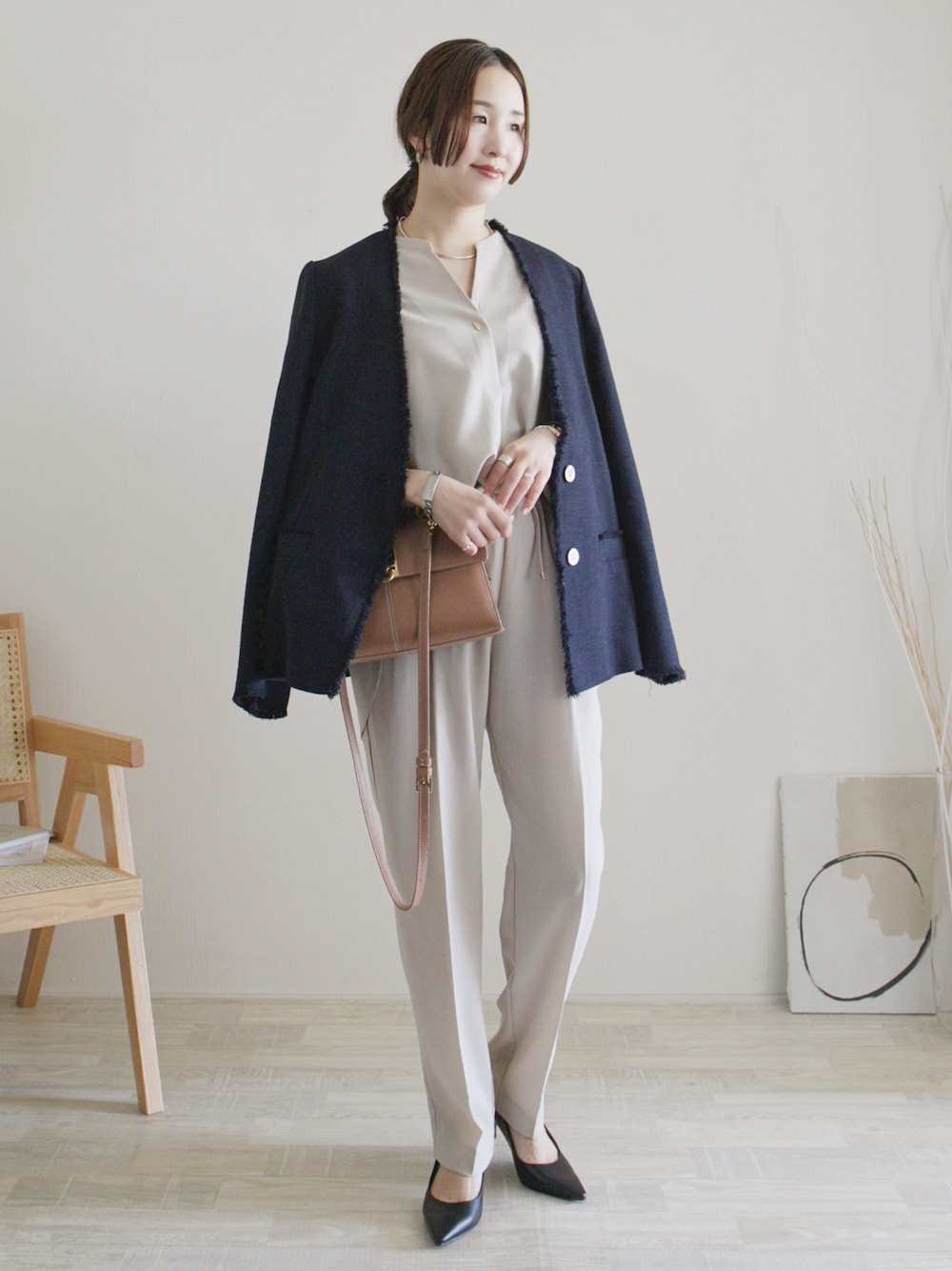 ジャケットは肩掛けが好きです✨ ジャケット/FREE ブラウス/38 パンツ/38 シューズ/35 Instagram / yoahiru.w 156cm/ブルベ夏/骨格ナチュラル×ストレートmix