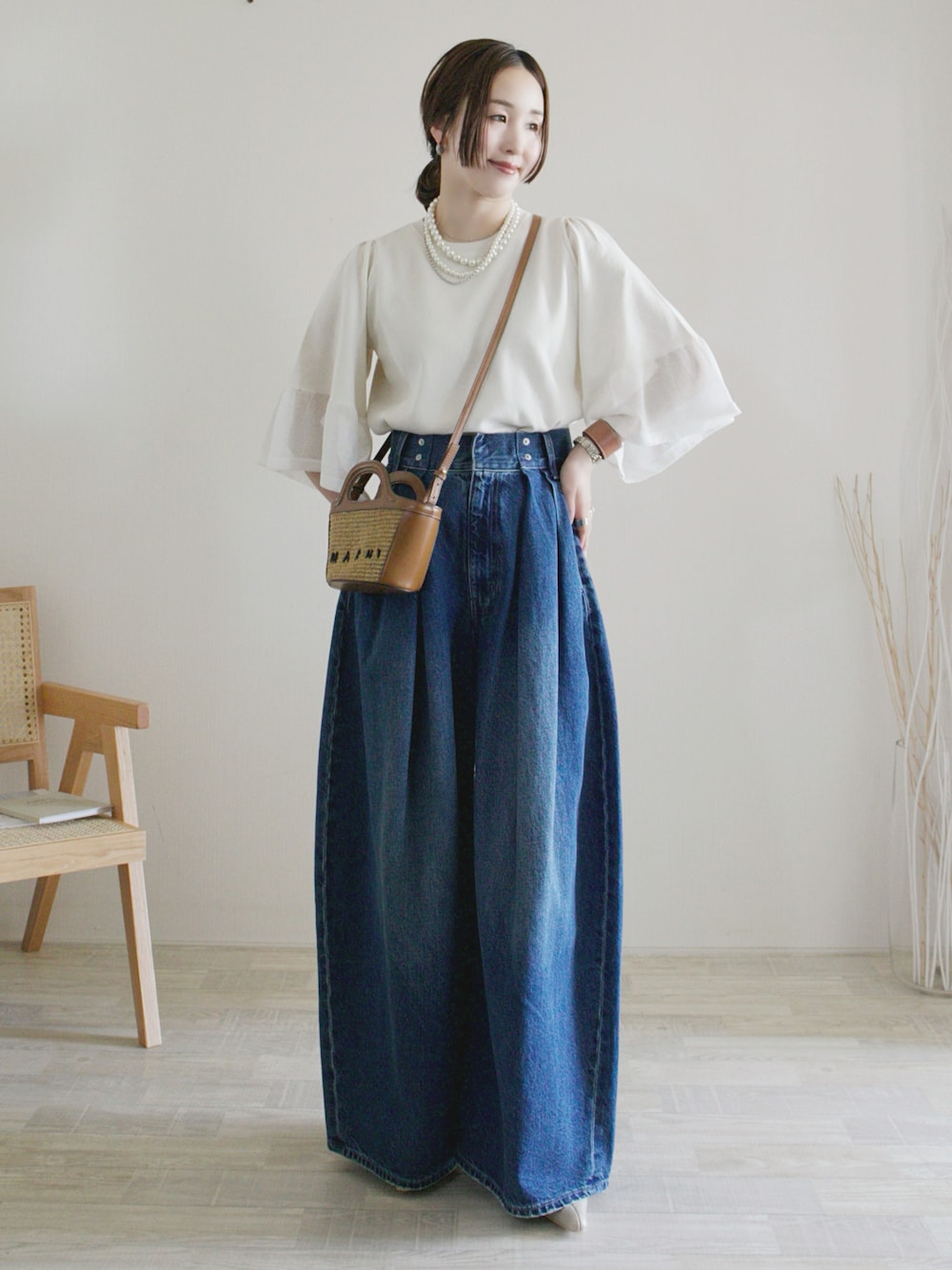 陽のデニムパンツ「ビッグタックワイドデニムパンツ」を使ったコーディネート