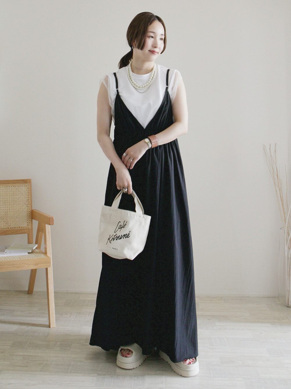 陽のワンピース「ボリュームマキシキャミワンピース / 前後2WAY」を使ったコーディネート