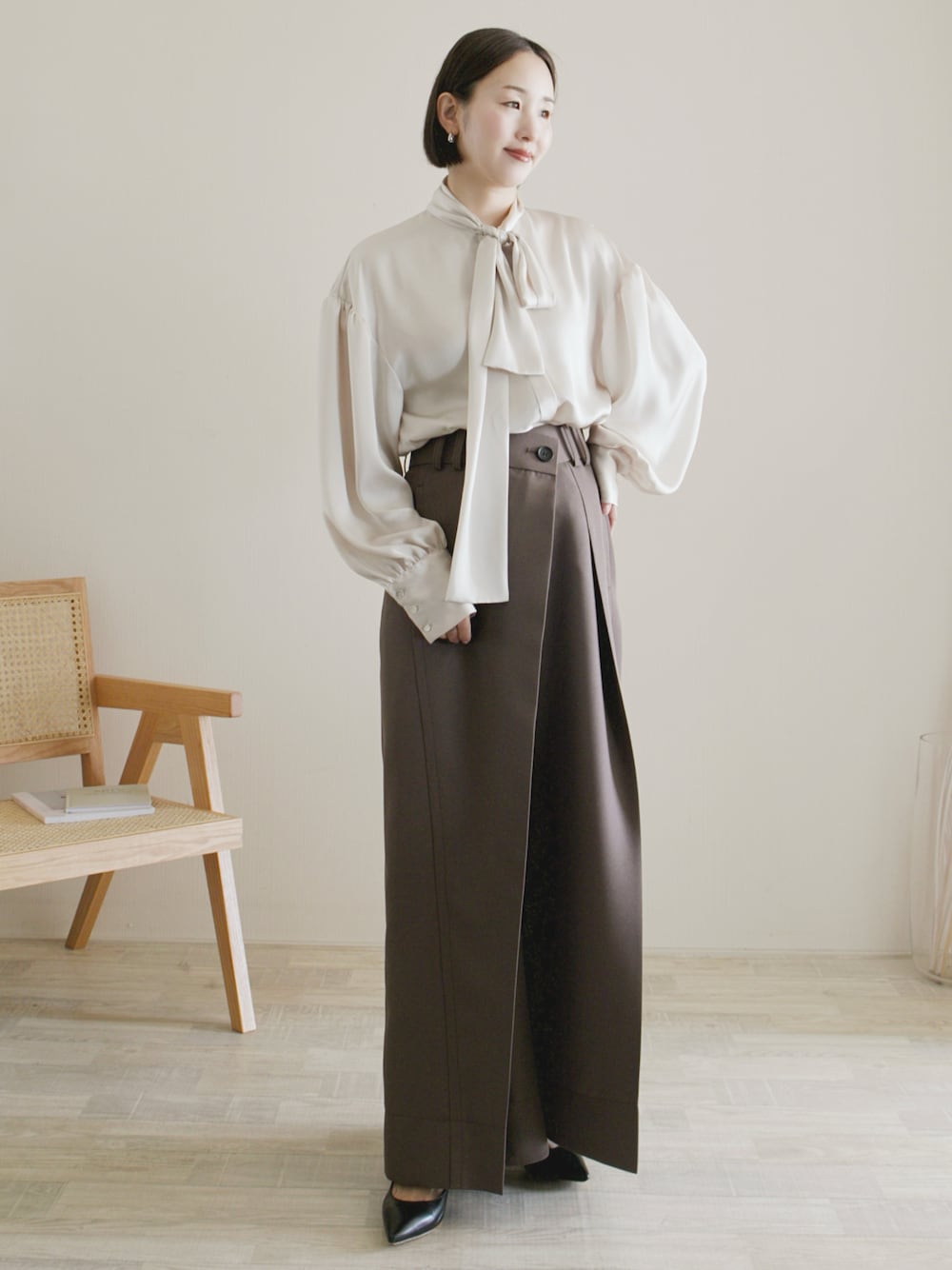 陽のシャツ/ブラウス「サテンボウタイブラウス」を使ったコーディネート