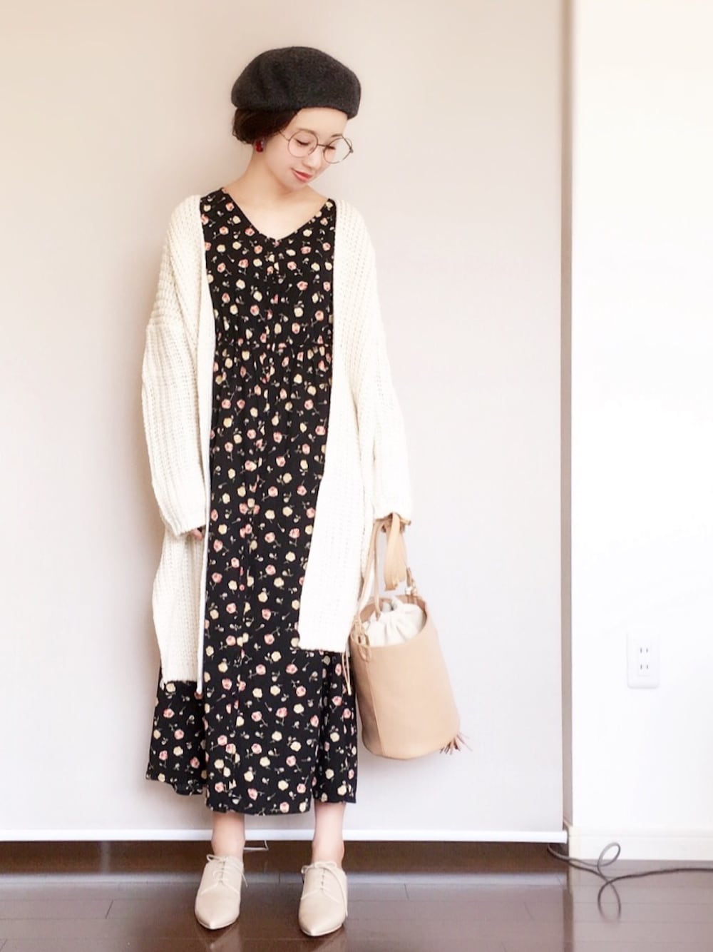 タグに乗っかって今日もベレー帽で(^ ^) ざっくりロングカーデ、 ヘビロテしています。